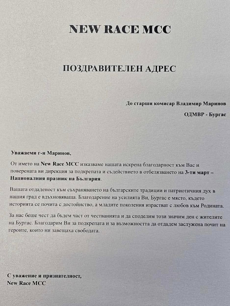 Поздравителни адреси от NEW RACE MCC бяха връчени днес на директора на ОДМВР-Бургас старши комисар Владимир Маринов и началника на отдел "Охранителна полиция и КАТ" комисар Марин Димитров. От мото-клуба благодарят за подкрепата и съдействието, оказани им от бургаските полицейски служители при отбелязване на Националния празник на България - 3-ти март.