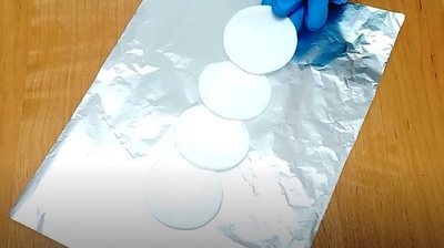 Поставете единия лист фолио на плота, отгоре подредете 3-4 тампона за разгримиране така, че да се застъпват.