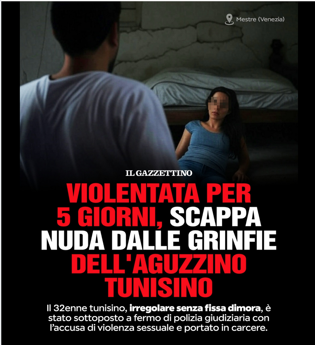 Жесток случай на сексуално насилие, отвличане и малтретиране потресе Италия. 32-годишен тунизиец, пребиваващ нелегално и без постоянен адрес, бе задържан от полицията в Местре по обвинение в продължително изнасилване.