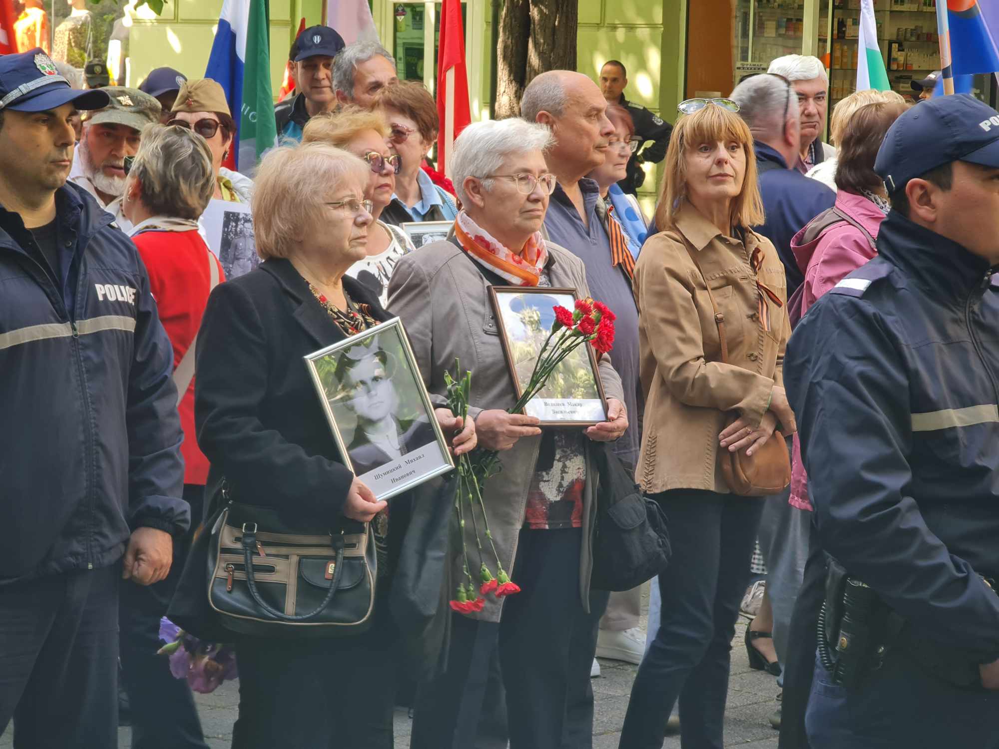 След като премина по ул. "Александровска" под звука на традиционни съветски песни, шествието спря пред Паметника на съветската армия, познат като Альоша, за да поднесе цветя и венци.