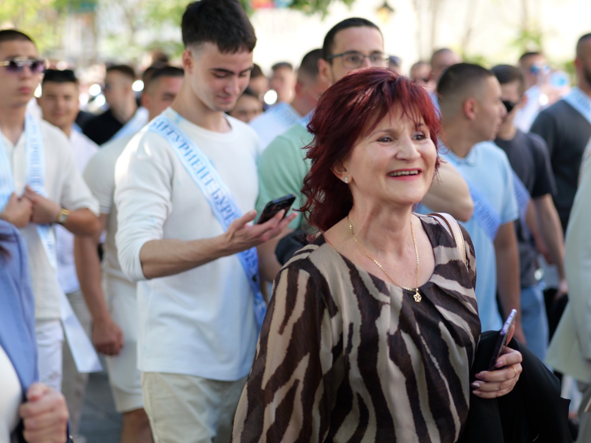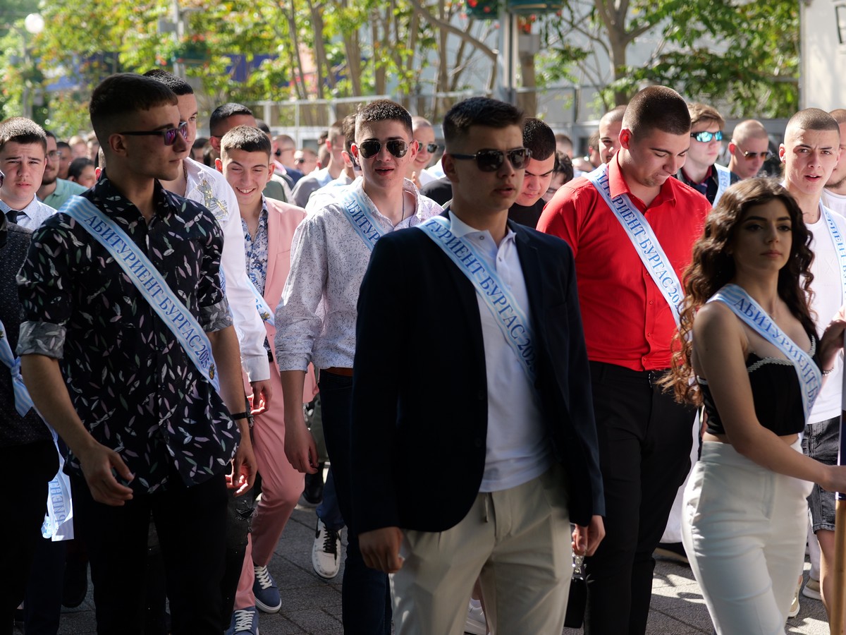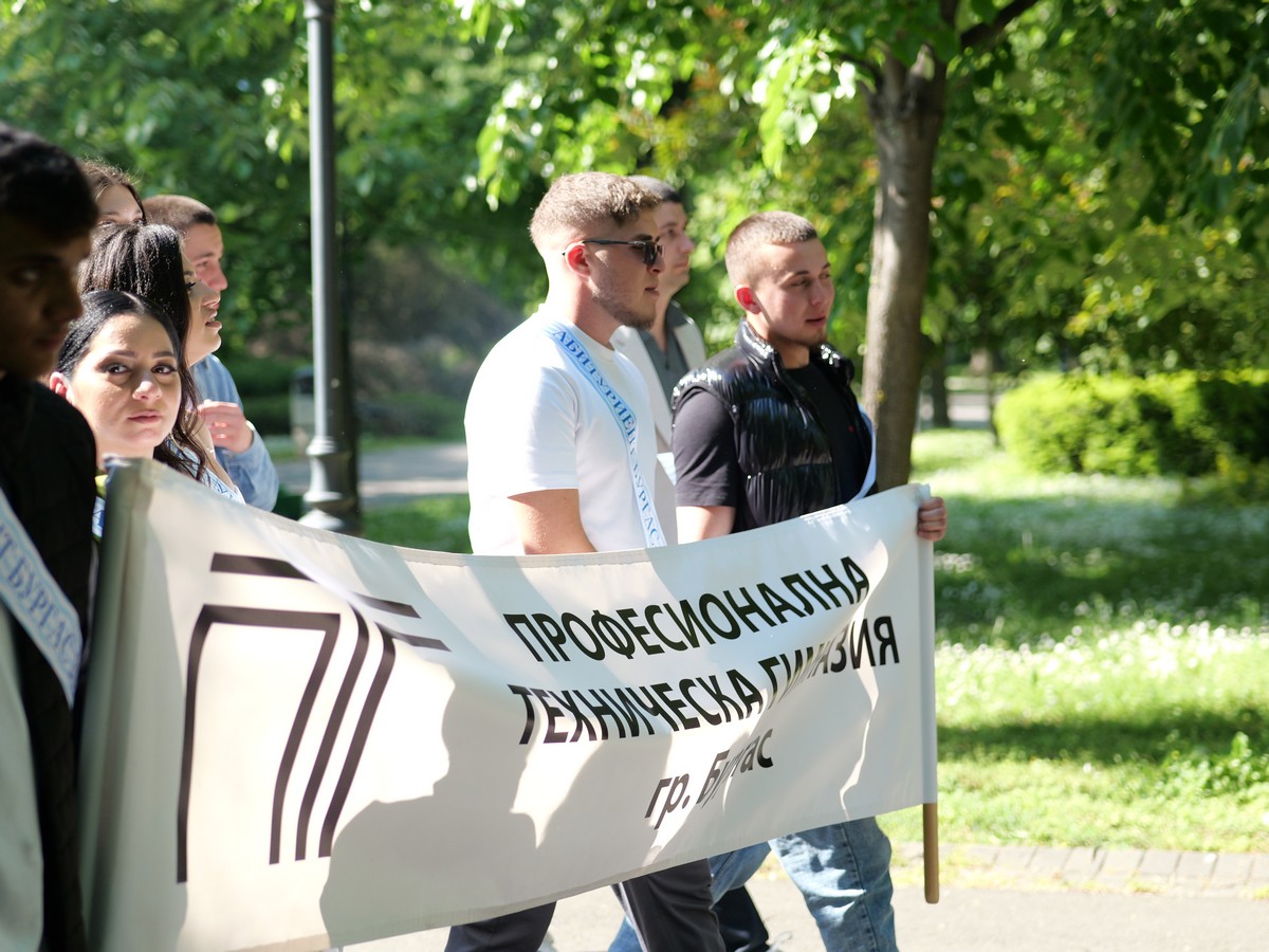Точно в сърцето на Бургас младежите преминаха в колона, облечени в тържествени тоалети, посрещнати от аплодисменти, радост и вълнение от близки, приятели и граждани. Атмосферата беше празнична, с музика, усмивки и национални флагове.