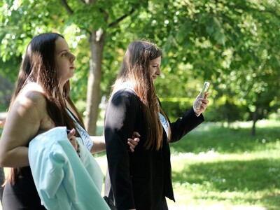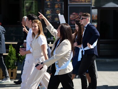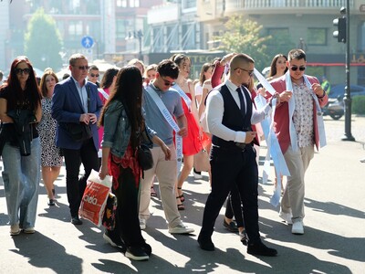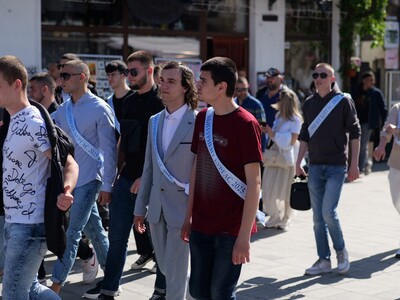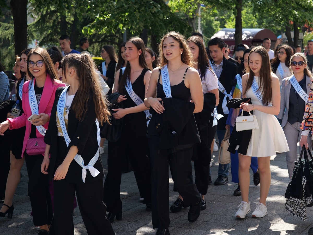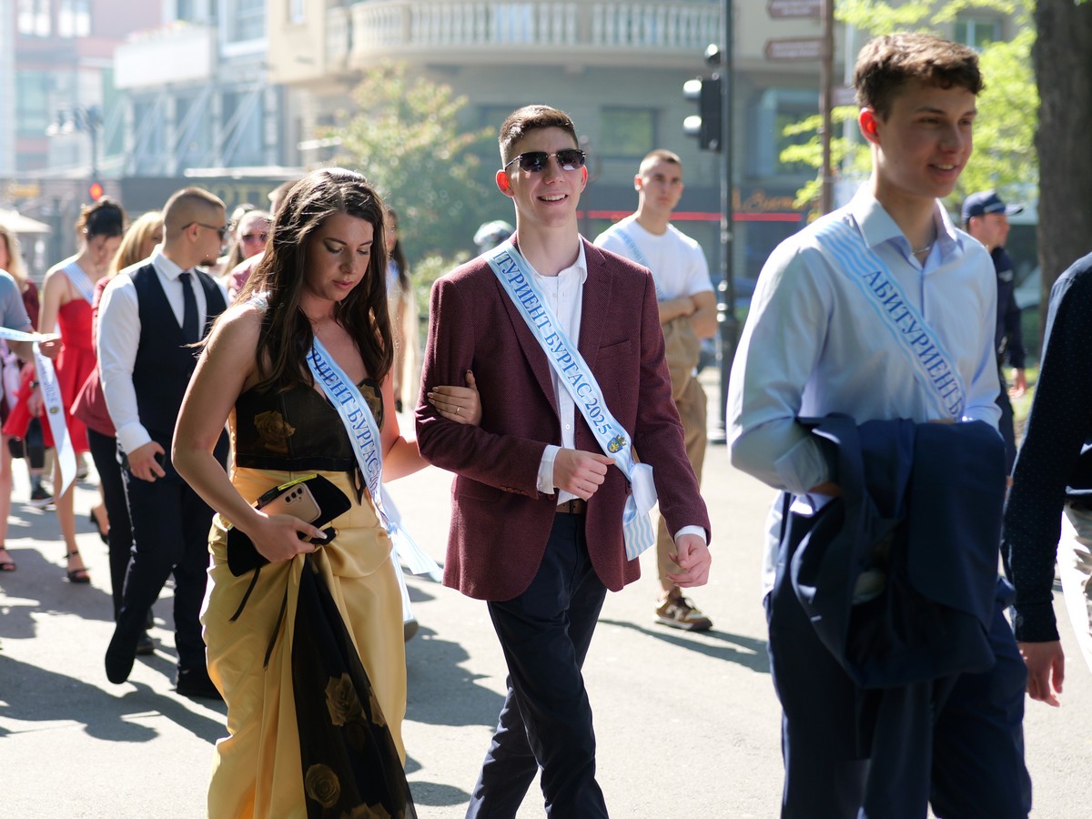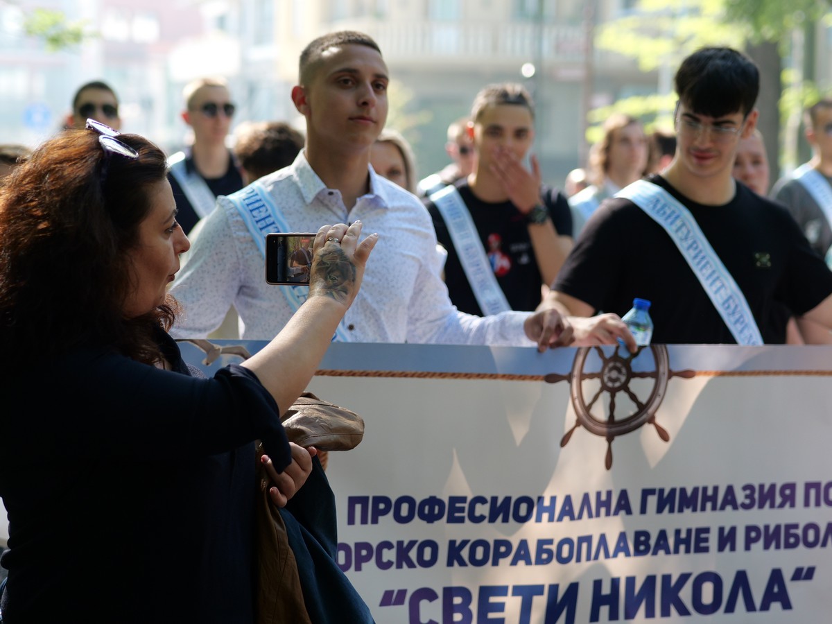 Точно в сърцето на Бургас младежите преминаха в колона, облечени в тържествени тоалети, посрещнати от аплодисменти, радост и вълнение от близки, приятели и граждани. Атмосферата беше празнична, с музика, усмивки и национални флагове.