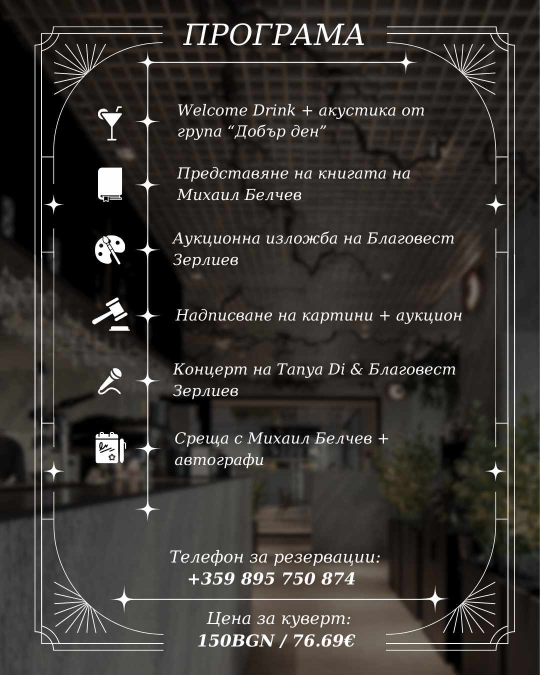 Зрителите ще имат изключителната привилегия да се насладят на концертна програма, художествена изложба и литературна премиера в едно неповторимо преживяване.