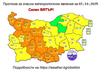 Оранжев код в 11 и жълт за 16 области за опасно време е обявен за утре, 2 октомври