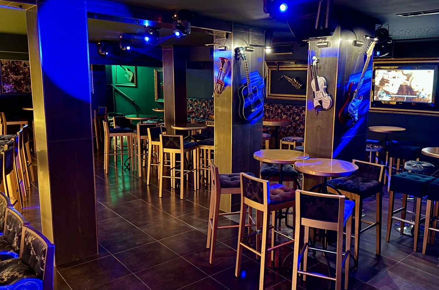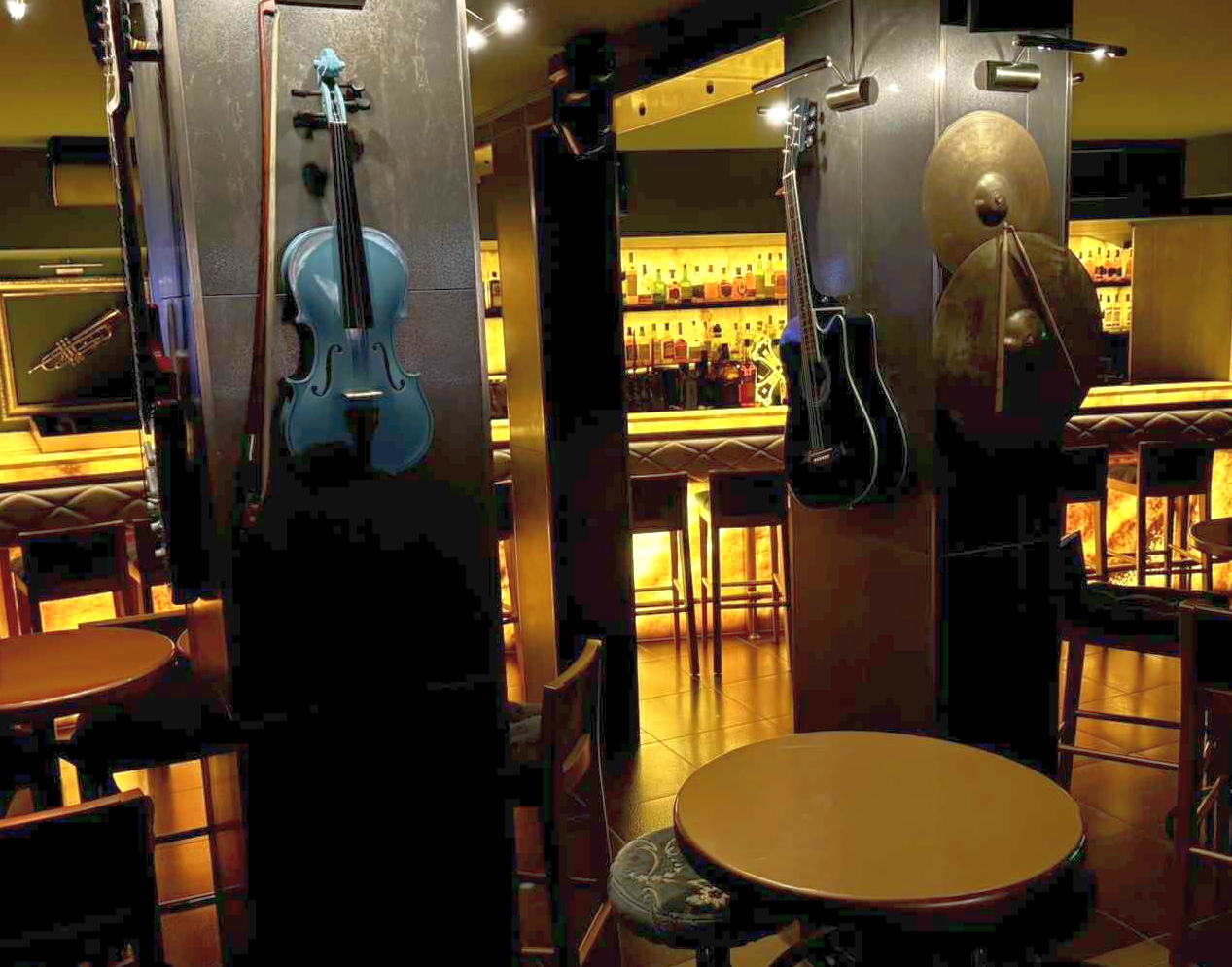 Уютните сепарета създават задушевна атмосфера, а интериорът носи духа на елегантния барок - автентични тромпет, саксофон, класическа цигулка и други изящни инструменти пръскат златист блясък от пищни рамки и подсказват, че това е място за истинска музика и споделени моменти.