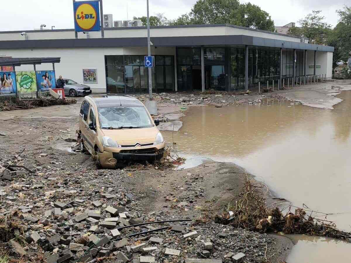 Ритейл паркът, намиращ се на входа на града - до автогарата е със сериозни поражения. Обектът на веригата Лидл пък буквално е отнесен от потопа.