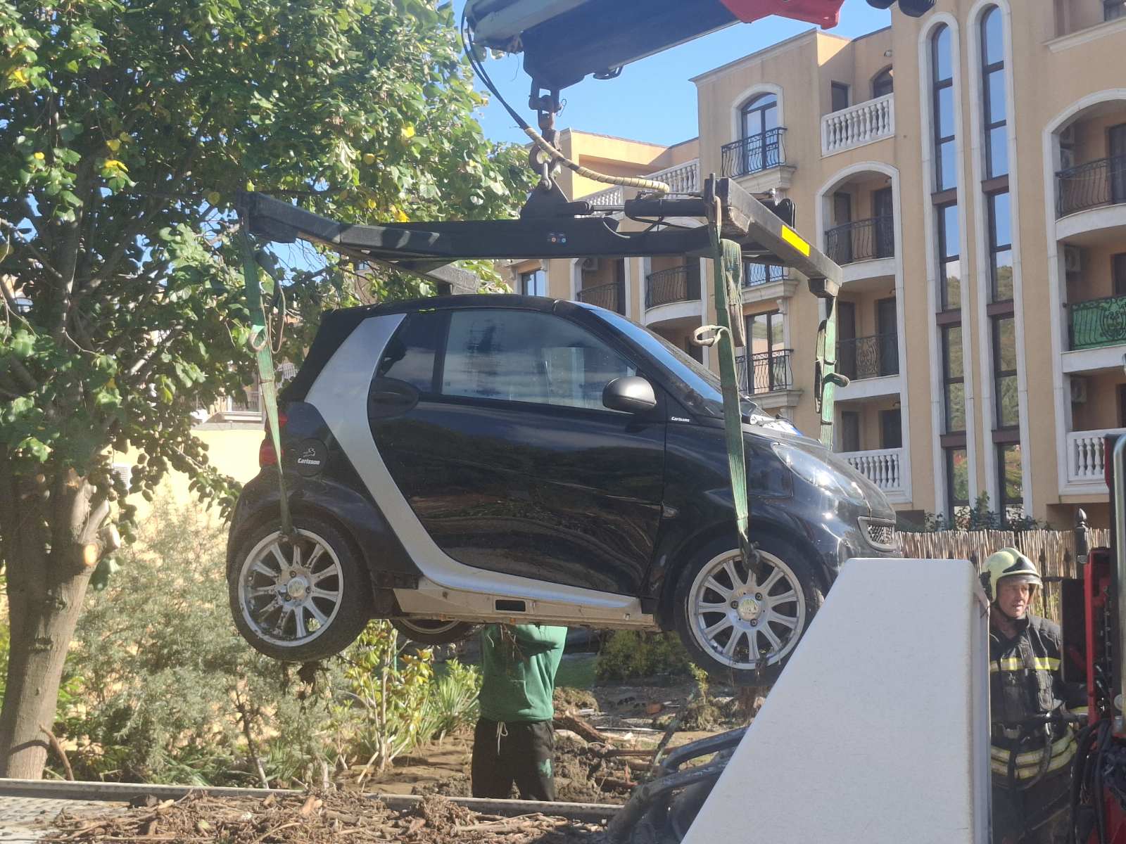Тежка техника е на мястото, за да могат най-тежко заседналите леки коли да бъдат репатрирани и извозени на чист терен, за да може разчистването след наводнението и оценката на щетите да продължи. До тук най-малко 25 са МПС-тата, които са отнесени, но има съмнения, че някои от паркираните по трасето на стихията автомобили са стигнали чак до морето. Предстои да бъдат търсени и там.