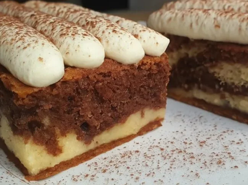 Приблизително половината от тестото изсипете в подготвената тава. Към другата половина внимателно добавете пресятото какао и го изсипете на зиг-заг върху светлото тесто в тавата.