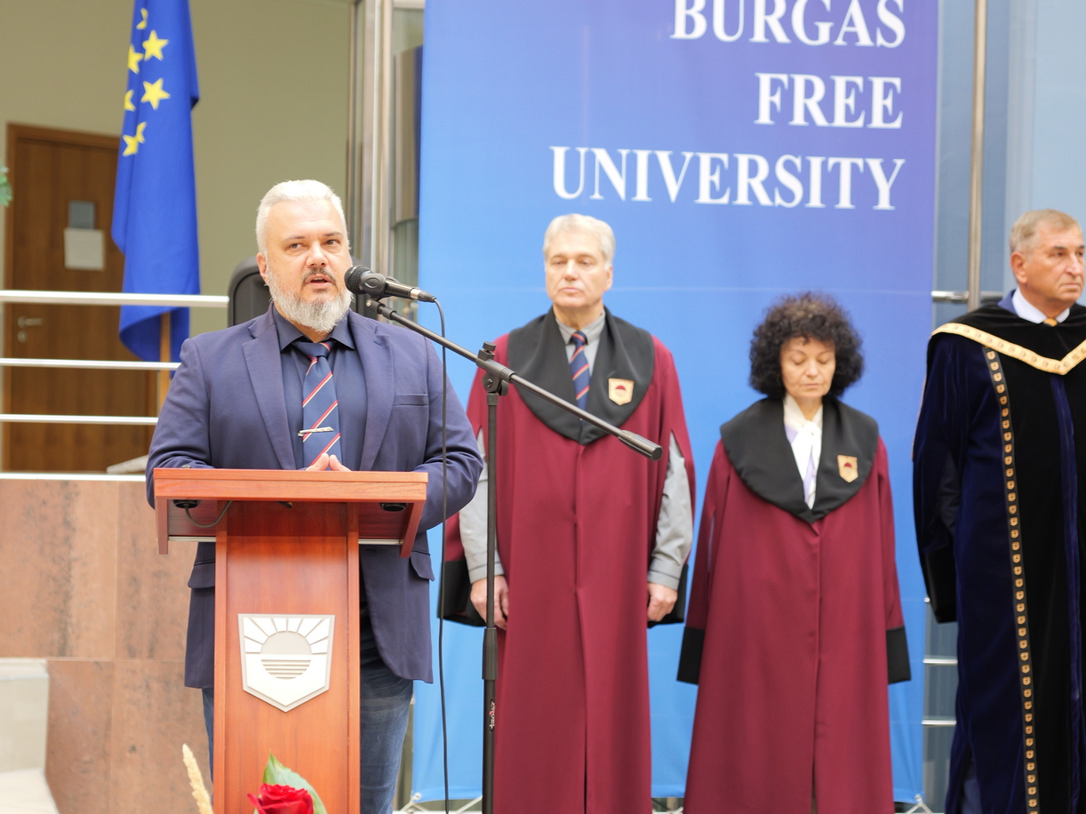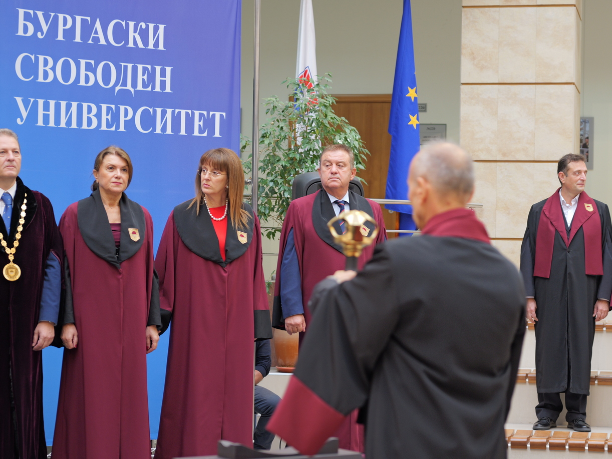 Бургаският свободен университет (БСУ) даде старт на новата академична година. Церемонията започна с тържественото внасяне на Университетския жезъл – символ на знанието, авторитета и приемствеността в академичната общност. Процесията бе водена от президента на БСУ проф. д-р Петко Чобанов, ректора проф. д-р Милен Балтов, ректорското ръководство, деканите на факултетите и целия академичен състав.