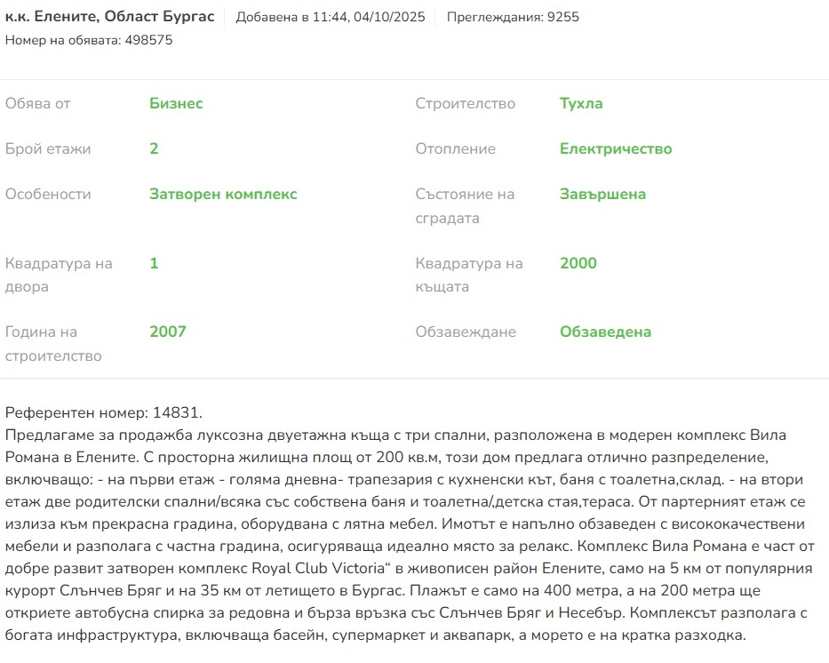 „Предлагаме за продажба луксозна двуетажна къща с три спални, разположена в модерен комплекс Вила Романа в Елените. С просторна жилищна площ от 200 кв.м, този дом предлага отлично разпределение, включващо: - на първи етаж - голяма дневна- трапезария с кухненски кът, баня с тоалетна,склад. - на втори етаж две родителски спални/всяка със собствена баня и тоалетна/,детска стая,тераса. От партерният етаж се излиза към прекрасна градина, оборудвана с лятна мебел. Имотът е напълно обзаведен с висококачествени мебели и разполага с частна градина, осигуряваща идеално място за релакс“, пишат брокерите и обявяват цената на имота . 528 хил. лева или 270 хил. евро.