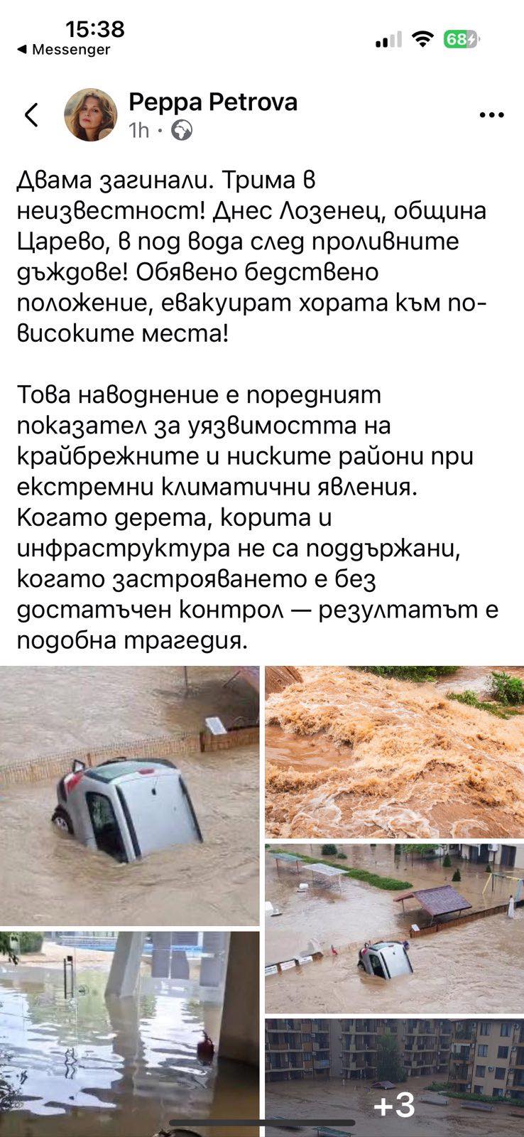 Нещо повече. От профил на жена с име Peppa Petrova е изстреляна „новина“ за двама загинали и трима в неизвестност. „Новината“ е подкрепена и с гневна позиция, че това наводнение е поредният показател на уязвимостта на крайбрежните райони при екстремни климатични явления.