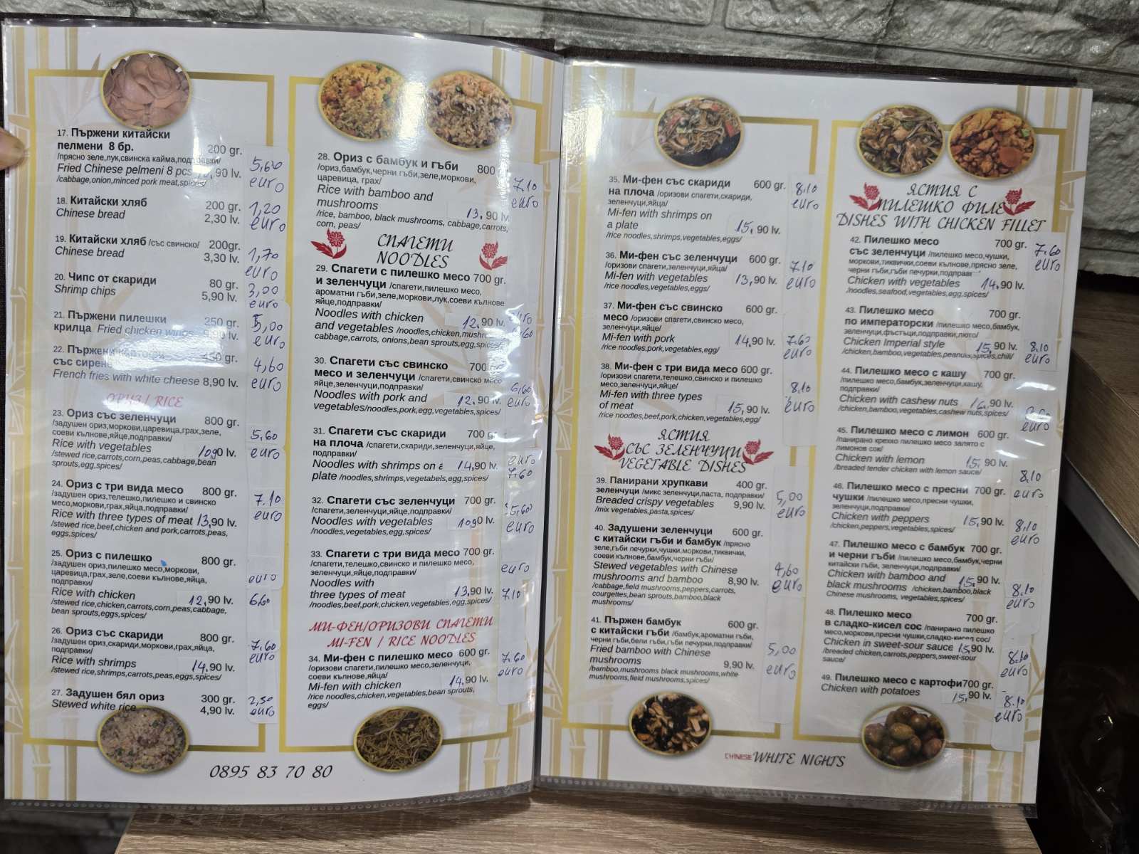 "Бели нощи" предлага разнообразно меню с класически китайски ястия, приготвени по оригинални рецепти, които ухаят на автентичност. Тук ще откриете всичко – от ароматни супи, апетитни оризови и нудъл специалитети, до панирани хапки, зеленчукови комбинации и месни ястия, които впечатляват не само с вкус, но и с щедри порции, които трудно ще изядете сами.