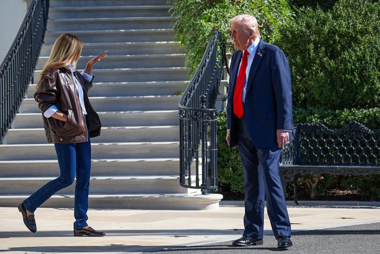 Мисис Тръмп слезе от Marine One на южната морава на Белия дом, демонстрирайки стилния си тоалет от шоколадовокафяво кожено яке, облечено върху бяла риза с небрежно навити ръкави.
