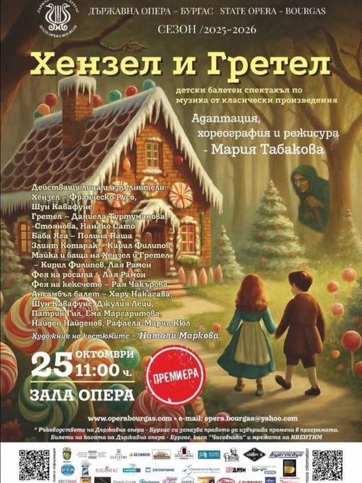 - Каня всички читатели на 25 октомври на премиерния балетен спектакъл „Хензел и Гретел“ от 11:00 ч. в Операта. Смятам, че танцовият спектакъл ще ви пренесе в един вълшебен свят, в който за малко ще можете да се откъснете от ежедневието и да се потопите в магията на танца.