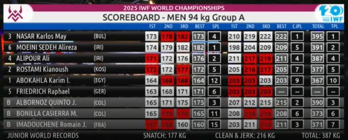 Насар обаче изоставаше в битката за мечтаната трета световна титла. Олимпийският ни шампион направи един успешен опит на 173 кг, а после изпусна щангата с тегло 178 и 182 кг. Основният му конкурент Седех пък счупи световния рекорд.