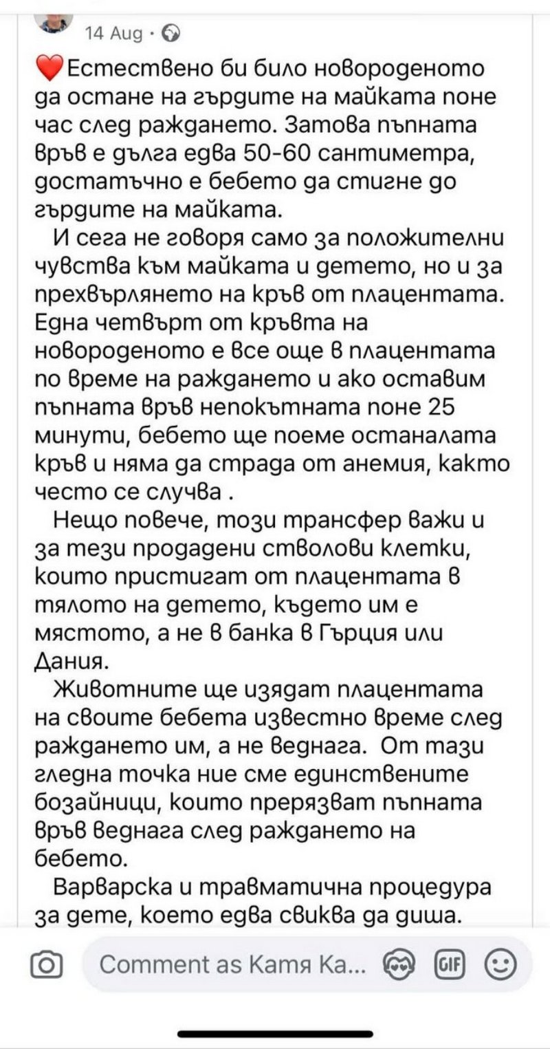 – Темата има два аспекта – психо-емоционален и медицински. От медицинска гледна точка най-важно е състоянието на новороденото в момента на раждането – дали диша добре, дали има достатъчно кислород, дали не се налага неонатологична намеса. Ако е необходима конкретна терапия, детето трябва веднага да се предаде на педиатър - компромиси не се правят. Когато обаче показателите на бебето на стабилни, а особено ако е и с по-малко телесно тегло, може да се забави прерязването на пъпната връв, за да се подобри кръвообращението в тялото му. Ако и майката е съгласна да го подържи в това състояние, то винаги се прилага. Психо-емоционалният аспект е свързан с изграждането на връзката между майката и новороденото – така наречената процедура „кожа в кожа“. И няма нищо лошо в това.