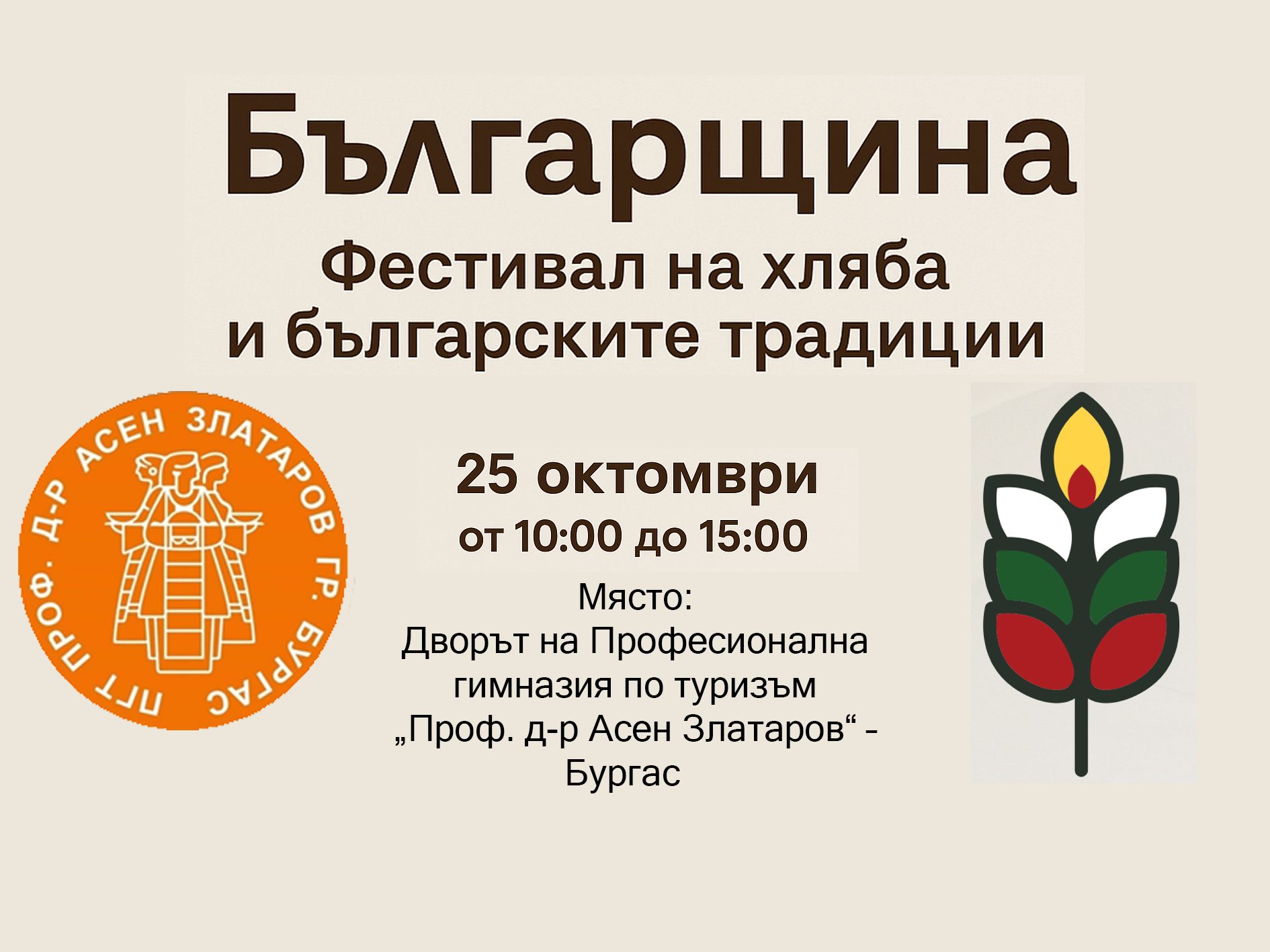 На 25 октомври от 10.00 ч. в двора на Професионалната гимназия по туризъм „Проф. д-р. Асен Златаров“- гр. Бургас ще имате възможност да опитате вкусни питки, хлябове, баници, кифли и други изделия