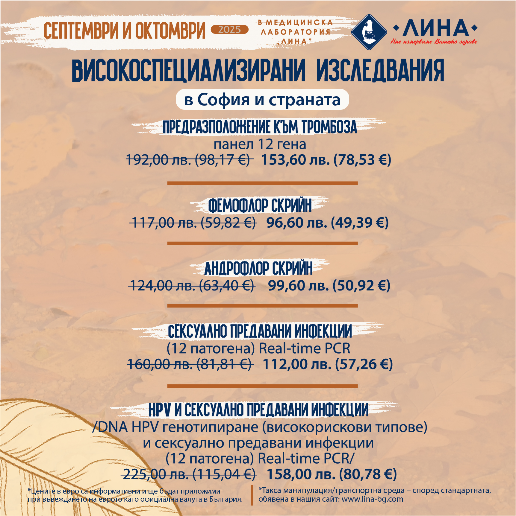 До края на октомври 2025 г. кампанията с високоспециализирани изследвания на преференциални цени в „ЛИНА“ включва: предразположение към тромбоза – панел 12 гена; Фемофлор скрийн; Андрофлор скрийн; сексуално предавани инфекции (12 патогена) Real-time PCR; DNA HPV гeнотипиране (високорискови типове) + сексуално предавани инфекции (12 патогена) Real-time PCR.