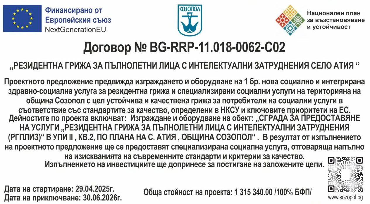 Четири къщи за хора с интелектуални затруднения ще бъдат построени в Атия. Кметът на Созопол Тихомир Янакиев огласи добрата новина, че днес е направена първата копка и коментира, че това е един от най-смислените проекти за общината – изграждането на база за предоставяне на грижи за гражданите с увреждания.