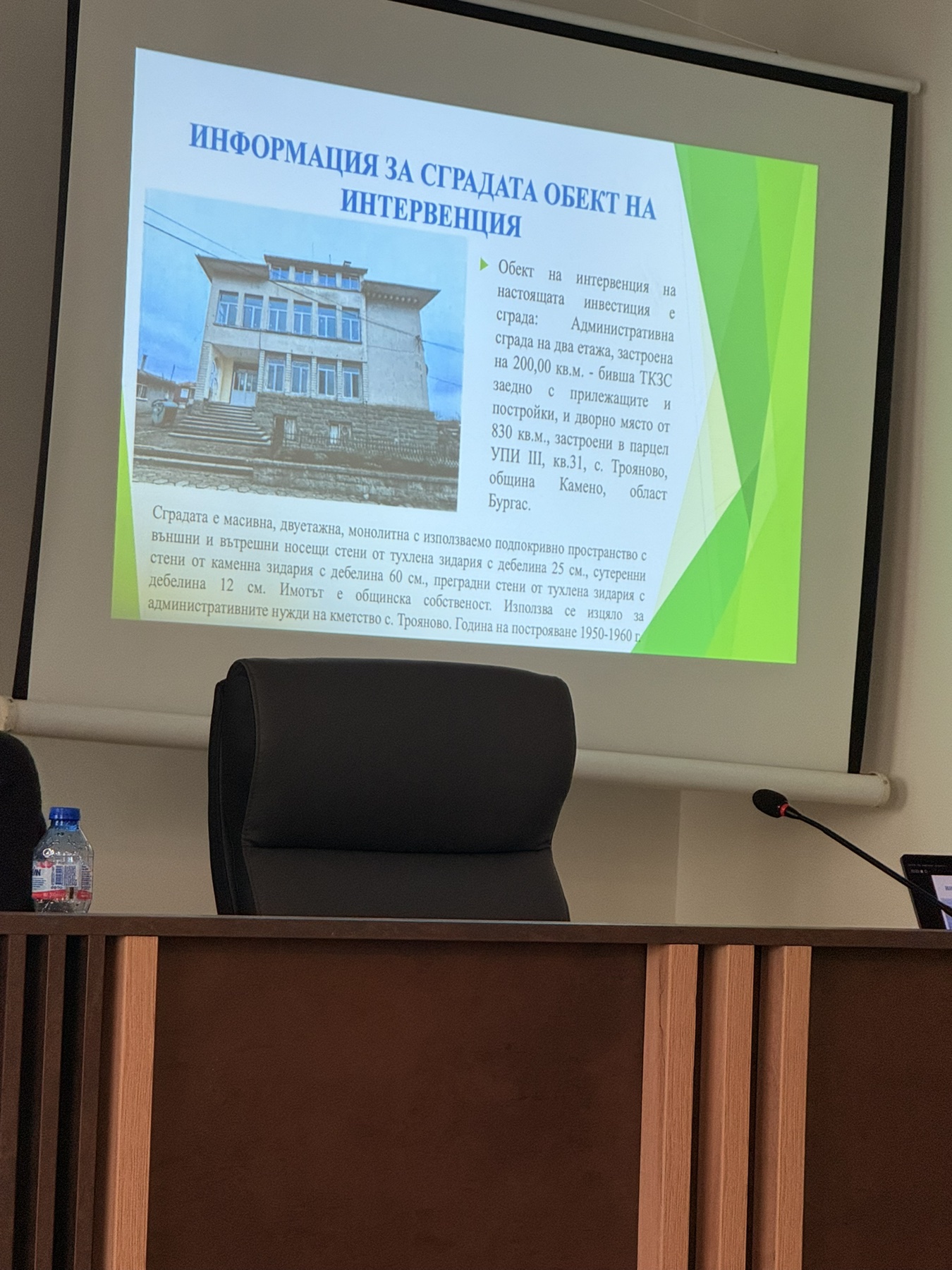 На 17.10.2025 г. в Община Камено се проведе финална пресконференция по проект № BG-RRP-4.020-0113 с наименование „Устойчиво енергийно обновяване на административна сграда – с. Трояново, община Камено“, финансиран по процедура BG-RRP-4.020 „Подкрепа за устойчиво енергийно обновяване на публичен сграден фонд за административно обслужване, култура и спорт“, посредством Механизма за възстановяване и устойчивост.