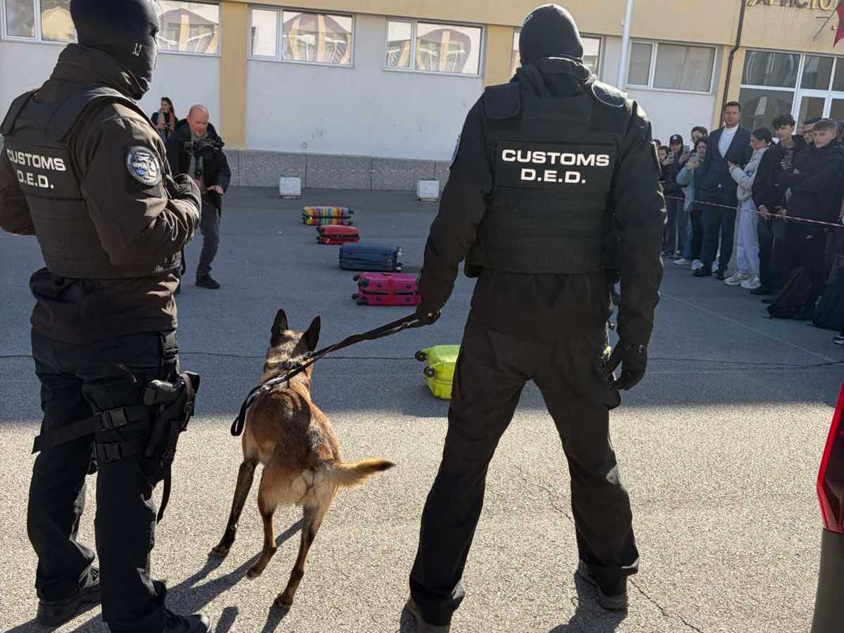 Двамата изнесоха презентации пред повече от 200 ученици и учители за рисковете от употреба на наркотици и хазартната зависимост. И двете лекции предизвикаха активни реакции и поредица въпроси, а на финала служители от отдел „Борба с наркотрафика“ направиха демонстрация на търсене на наркотични вещества с обучено митническо куче, в която се включиха и най-смелите сред учениците.