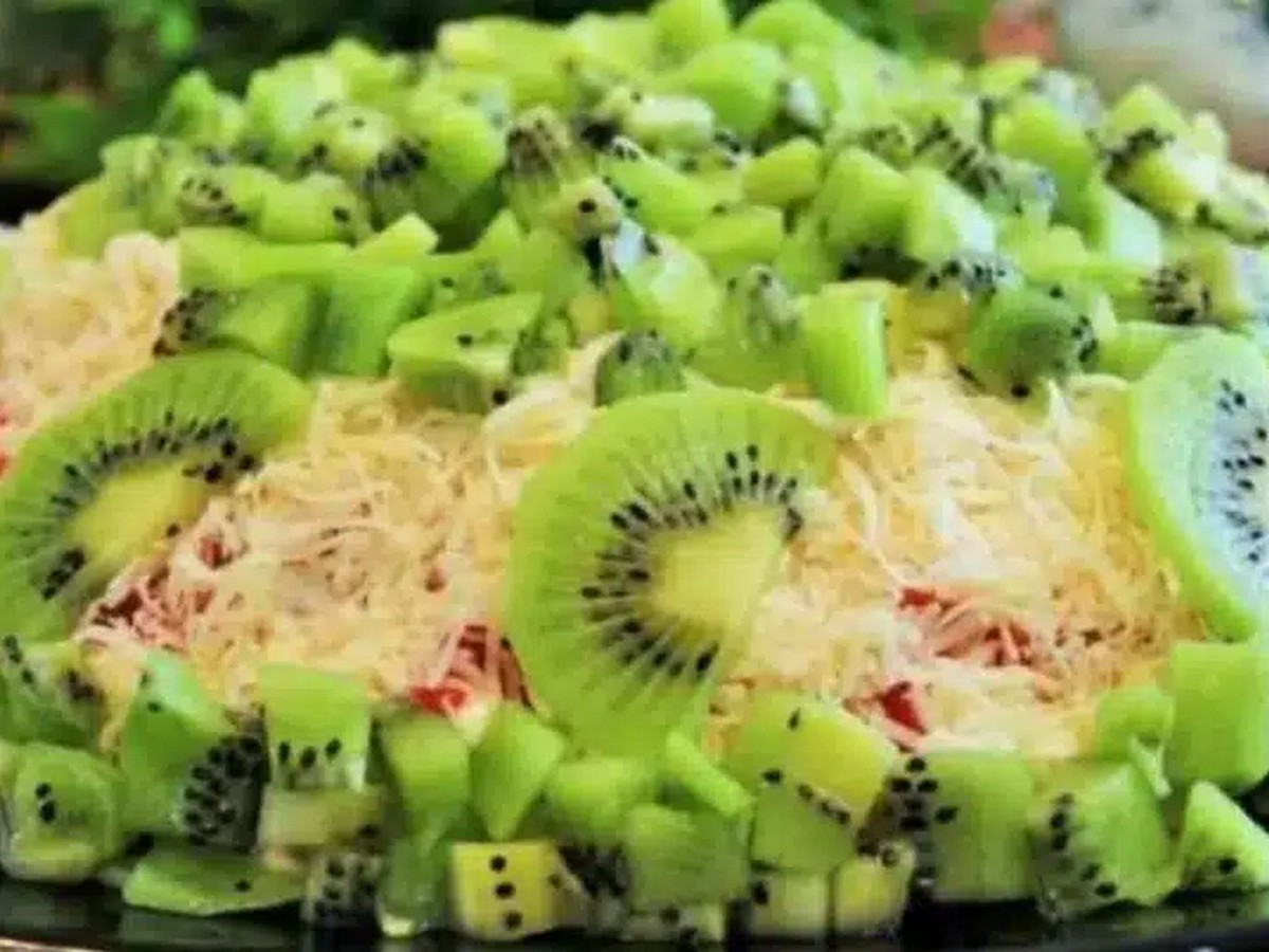 Салатата е желателно да бъде украсена с киви и жълтък. Пъхнете вкусната салата в хладилиника на студено за период от 50 минути, след това извадете и сервирайте. Бон апети!