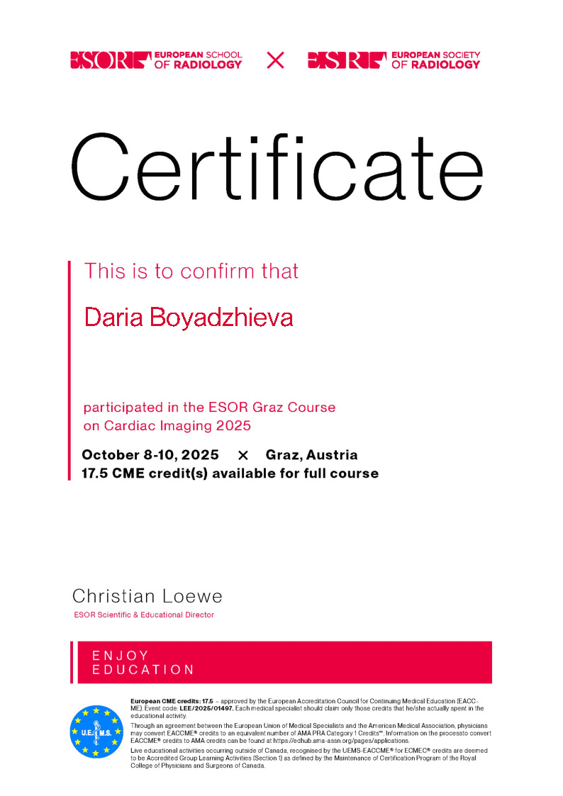 Д-р Дария Бояджиева успешно премина курс „Graz tutorial: Cardiac imaging”, организиран от Европейското училище по образна диагностика /ESOR/ в партньорство с Медицинския университет в Грац. Обучението бе насочено към специализанти последна година или наскоро сертифицирани рентгенолози, които искат да повишат квалификацията си в областта на образната диагностика на сърцето.