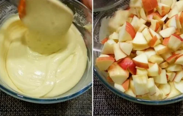 Изсипете нарязаните ябълки директно в тестото и разбъркайте добре, за да може всяко парченце да се покрие с течната смес. Това е тайната на сочността!