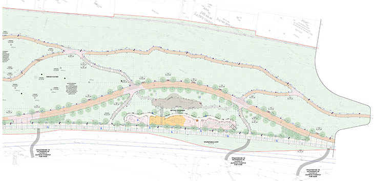 Всички алеи в парка са проектирани с настилки, които не позволяват инфилтрацията на дъждовна вода в почвата, а я отвеждат повърхностно към линейни отводнители, разположени по крайбрежната алея в близост до съществуващ дъждовен колектор. Цветовата гама и текстурата на настилките са подбрани в съответствие с природните характеристики на зоните, в които се намират.