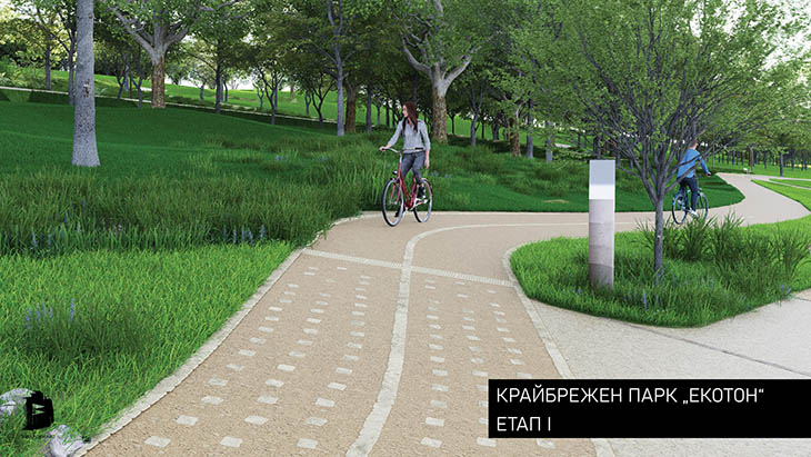 Автомобилният достъп в рамките на двата имота е силно ограничен и предназначен единствено за специализирани превозни средства в определен часови диапазон. Велосипедната алея е логично продължение на веломаршрута от Бургас и е функционално отделена от главната пешеходна алея – както чрез озеленяване, така и чрез разлика във височината. При достигане до централната част на парка и плажа алеята ще преминава в сърцевината на територията, северно от детска площадка „Екотон“, което ще позволява пешеходната алея да остане спокойна и безконфликтна. Велосипедната алея ще се отличава с панорамни гледки и зони за отдих. На местата, където ще пресича пешеходни маршрути, ще бъде положена маркировка от бели варовикови павета, вградени в настилката. Това служи както за визуално разграничаване, така и за забавяне на велосипедното движение.