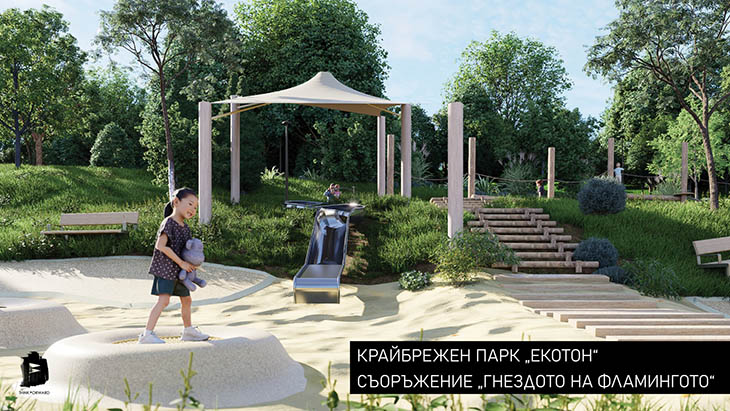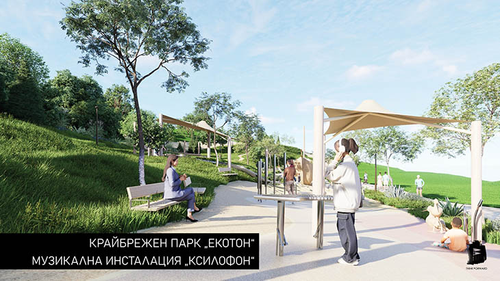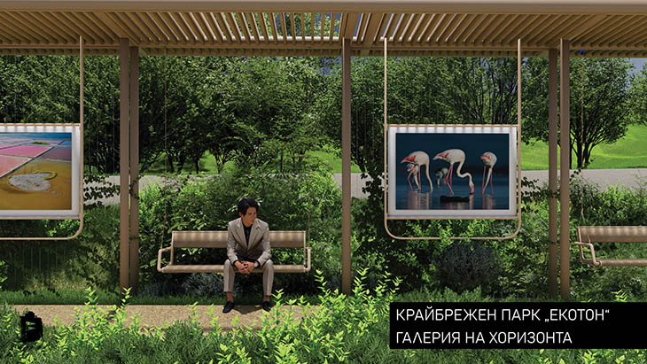 Новите паркови зони ще включват Зона за изложби, отдих и рекреация, като в източната част на крайбрежния парк е проектирана многофункционална пергола от метална поцинкована конструкция с увивна растителност. Перголата ще е оборудвана с пейки тип „фиксирани люлки“, а между пейките са проектирани изложбени зони. Гърбът на тези участъци е решен с конструкция от стоманени въжета за увивна растителност.