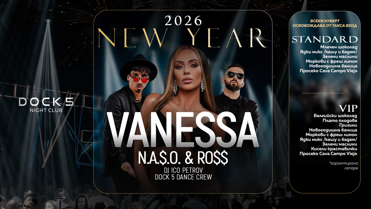 На 31 декември сцената ще оживее с енергията на Ванеса и динамичното дуо Naso & Ross, които ще посрещнат 2026-та с много музика и настроение.