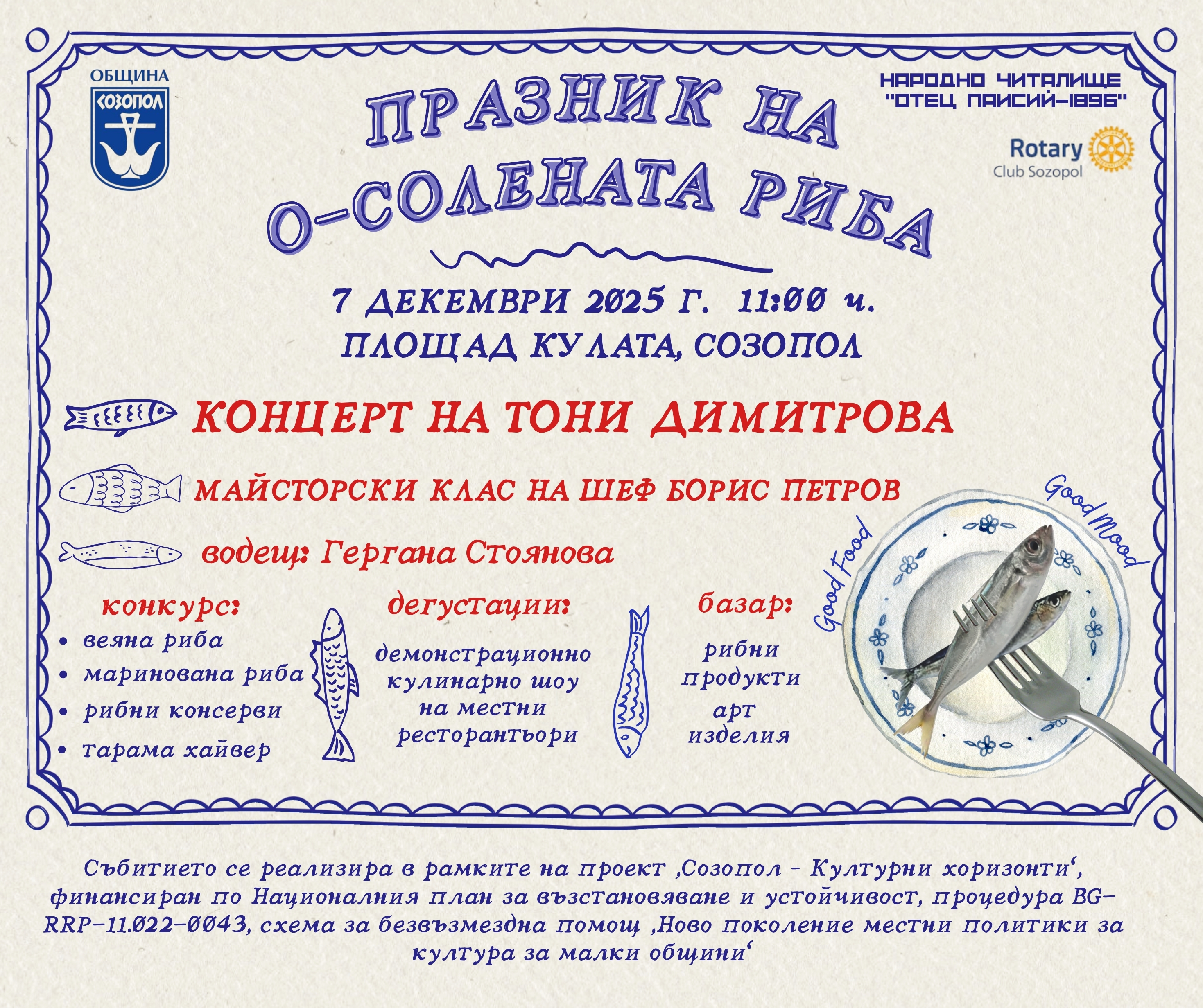 На 7 декември 2025 г. (неделя) от 11:00 часа на площад „Кулата“ в Созопол ще се проведе петото издание на Празника на О-солената риба – събитие, което събира жители, гости, рибари, кулинари и всички почитатели на морето и неговите вкусове.