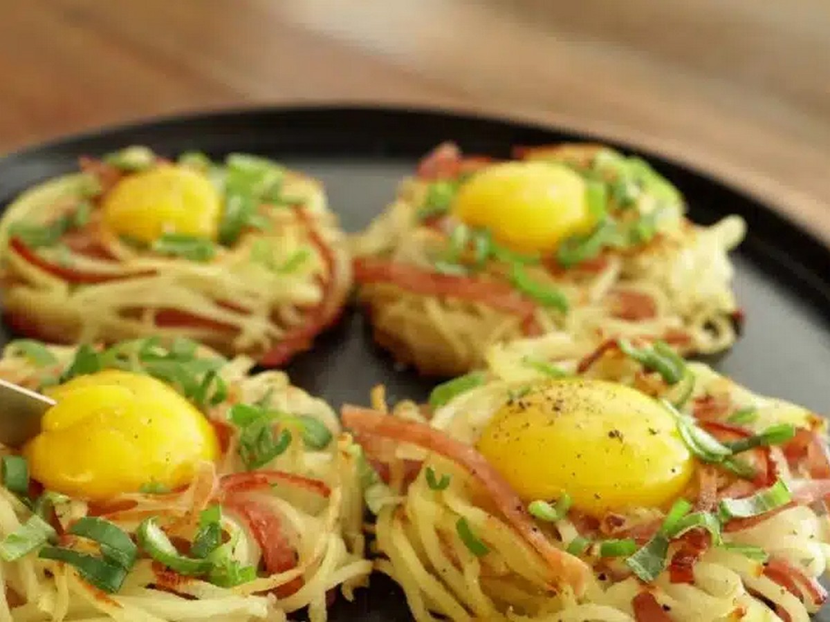 Оригинална алтернатива на картофените кюфтета за закуска: картофени „гнезда“ с шунка и жълтък. Тази закуска се приготвя доста бързо, получава се много вкусна и ефектна.