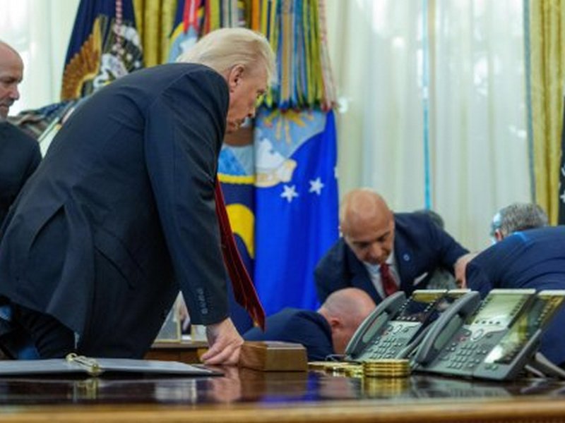 Тръмп стана от бюрото си и се обърна към мъжа, лежащ на пода, преди прякото предаване да бъде прекъснато.