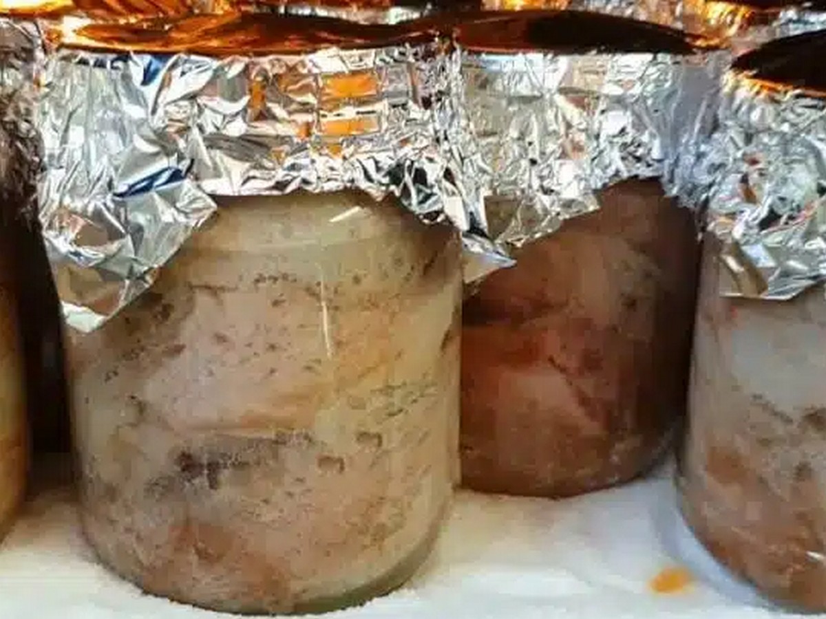 Първо стерилизирайте капачките. Извадете бурканите от фурната и махнете фолиото. Притиснете месото в сока с лъжица. Отгоре се добавят 2-3 с.л. мазнина във всеки буркан, затвирете го. Изчакайте да изстине напълно. Поставете в хладилника. Мазнината ще се втвърди и ще запази месото още по-добре! Съхранявайте на хладно и тъмно място и извадете при необходимост.