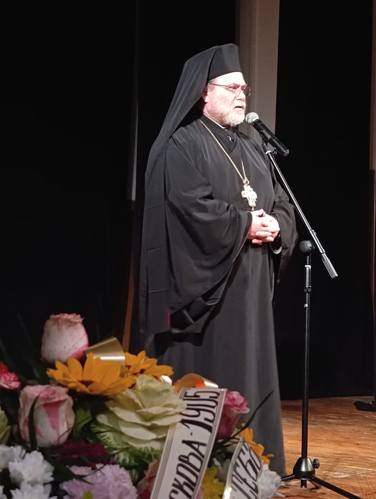 От името на сливенския митрополит Арсений поздрав за годишнината на читалището произнесе негово високопреподобие архимандрит Дмитрий протосингел и архиерейски наместник на гр. Бургас.