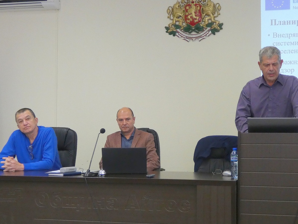 Подробности за дейностите, чиято основна цел е повишаване на енергийната ефективност чрез технологично обновяване, представиха зам.-кметът на община Айтос Калоян Калоянов и ръководителят на екипа по проекта инж. Иван Биделев, както и представителят на фирмата-изпълнител Мирослав Илиев.