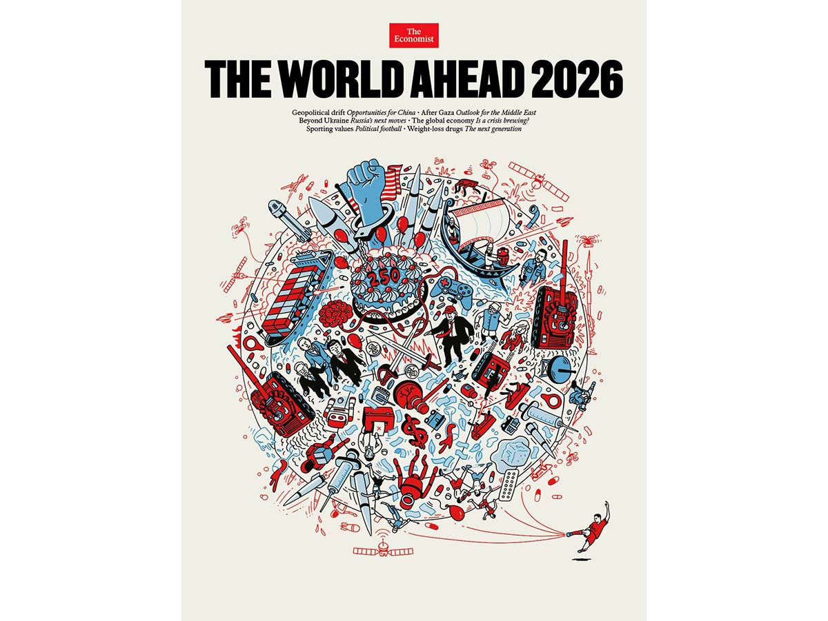 САЩ са вторият главен герой, след войната, върху корицата на „Ди икономист“. Цялостното усещане е, че навръх 250-годишнината от основаването на тази държава през 2026-а я чакат крах, бунтове, колапс и финансова криза. Доларът е съкрушен и отчаян, навсякъде се сипят непотребни акции, капещи като есенни листа, вероятно борсите са претърпели колапс. Към празничната торта е привързана белезница, която е обхванала бунтовническа китка. Тя обаче не стои примирено, а е замахнала в юмрук, символизиращ предстояща революция. Знамето на САЩ едва се вижда зад този сюжет.