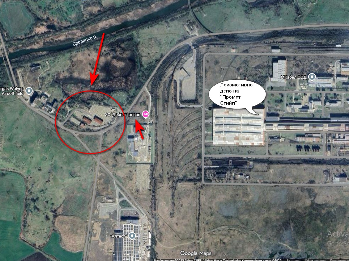 В момента в този парцел от над 33 дка, който виждате в овала на снимката, са изградени общо 10 броя едноетажни промишлени сгради в два терена, собственост на "Дебелтинженеринг" АД. През 2024 г. дружеството е отдало под наем парцела на фирмата "Ли-кинг батери БГ" ЕООД за ползване като площадка за дейности с отпадъци, включващо възстановяване и рециклиране на литиево-йонни батерии.