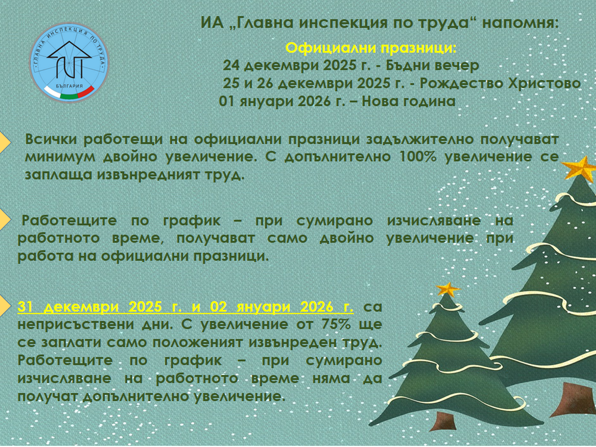 В поредицата от коледни и новогодишни празнични дни официални празници, според Кодекса на труда, са: 24 декември - Бъдни вечер, 25 и 26 декември - Рождество Христово, и 1 януари - Нова година. Положеният труд по време на тези празнични дни за всички работещи се заплаща с минимум двойно увеличение. Ако трудът е и извънреден, се дължи и допълнително 100% увеличение. Извънредният труд се възлага задължително със заповед на работодателя, с която работниците трябва да бъдат запознати най-малко 24 часа преди началото на полагането му.