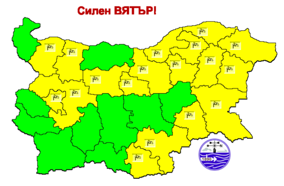 Жълт код за силен вятър обявиха от Националния институт по метеорология и хидрология (НИМХ) за областите София, София област, Монтана, Враца, Ловеч, Габрово, Търново, Русе, Търговище, Разград, Шумен, Варна, Добрич, Силистра, Бургас, Ямбол, Хасково и Кърджали.