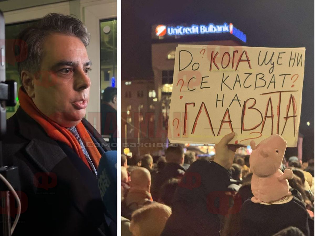 Напрежението пред сградата на Народното събрание в София не стихва. Преди минути председателят на „Продължаваме промяната“ Асен Василев се закани, че колегите му, които не са се съобразили с волята на народа и са гласували за повишаване на данъчната и на осигурителната тежест, ще се наложи да си подремнат не у дома, а на депутатските банки.