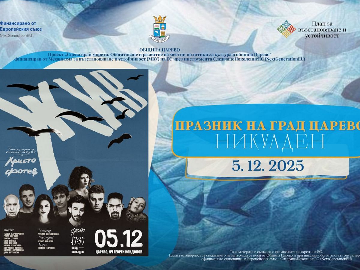 С поезия, музика и море ще бъде озарен стартът на Никулденските тържества в Царево тази година. На 5 декември от 17:30 ч. в залата на Народно читалище „Георги Кондолов“ ще се състои поетично-музикалният спектакъл „Жив“, създаден по стихове на обичания български поет Христо Фотев – гласът на морето, на любовта и на вечната носталгия.