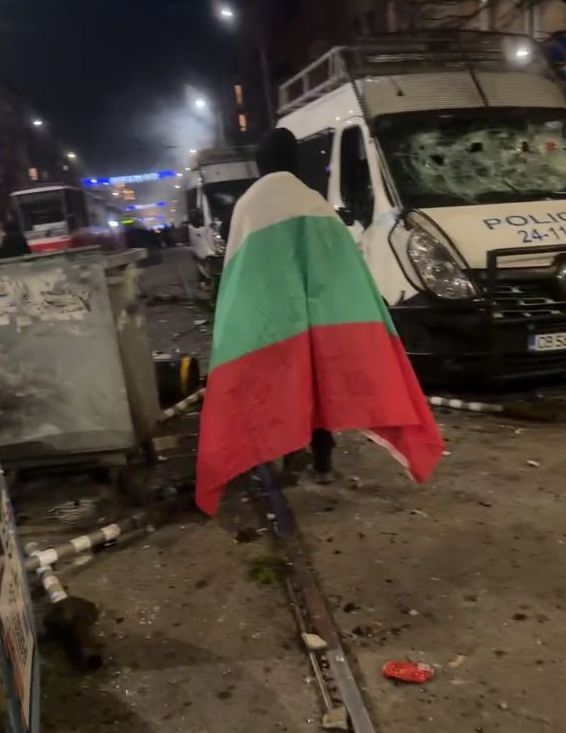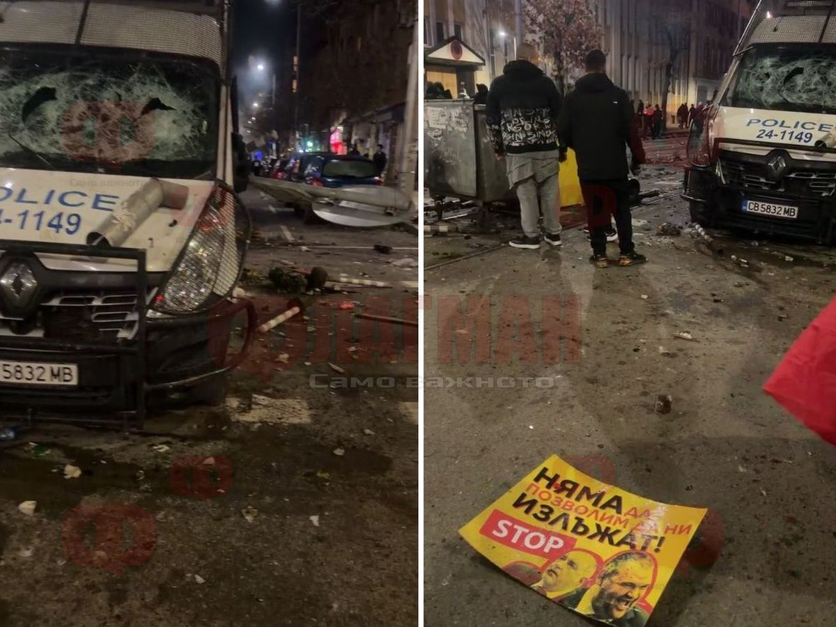 Гледката до централата на ГЕРБ е ужасяваща. Виждат се разпилени боклуци и потрушени полицейски бусове. От стъклото на един от тях се подава част от пътен знак.