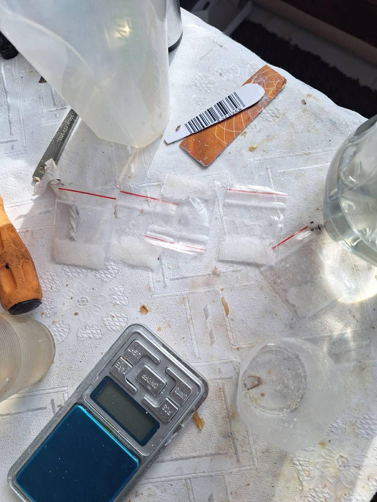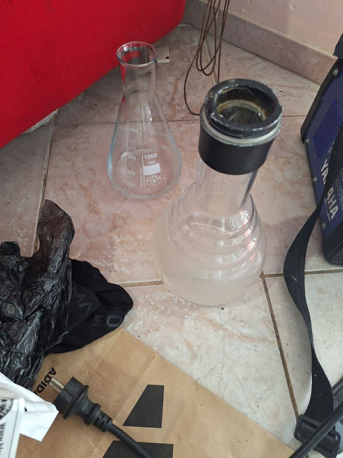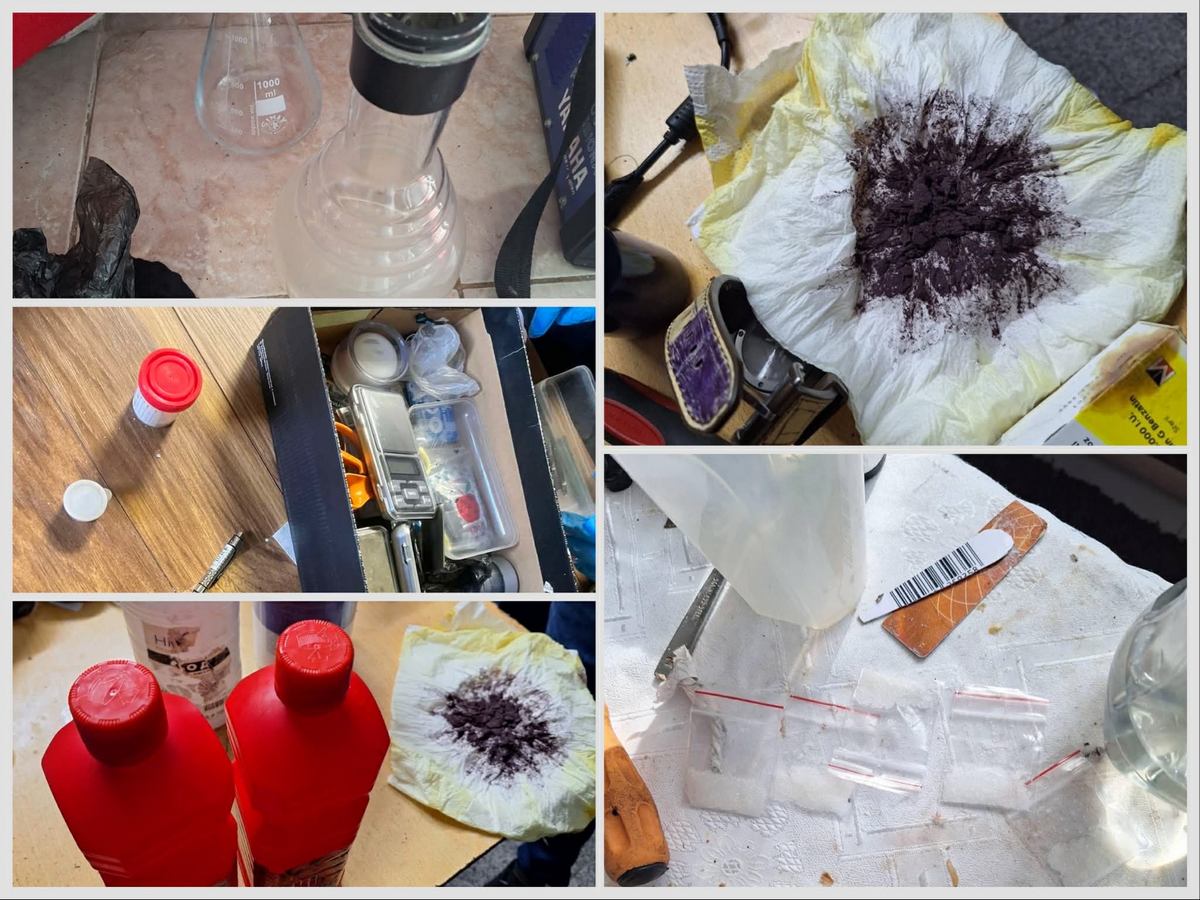 Криминално проявеният мъж разполагал с две бутилки с кислол, бутилка с люспи за почистване, бутилки с корселин, йод и ацетон, червено прахообразно вещество, което реагирало на фосфор, електронна везна, пакет с надпис "MCM" с тегло около 200 грама и др. Със сигурност става дума за нарколаборатория в домашни условия.