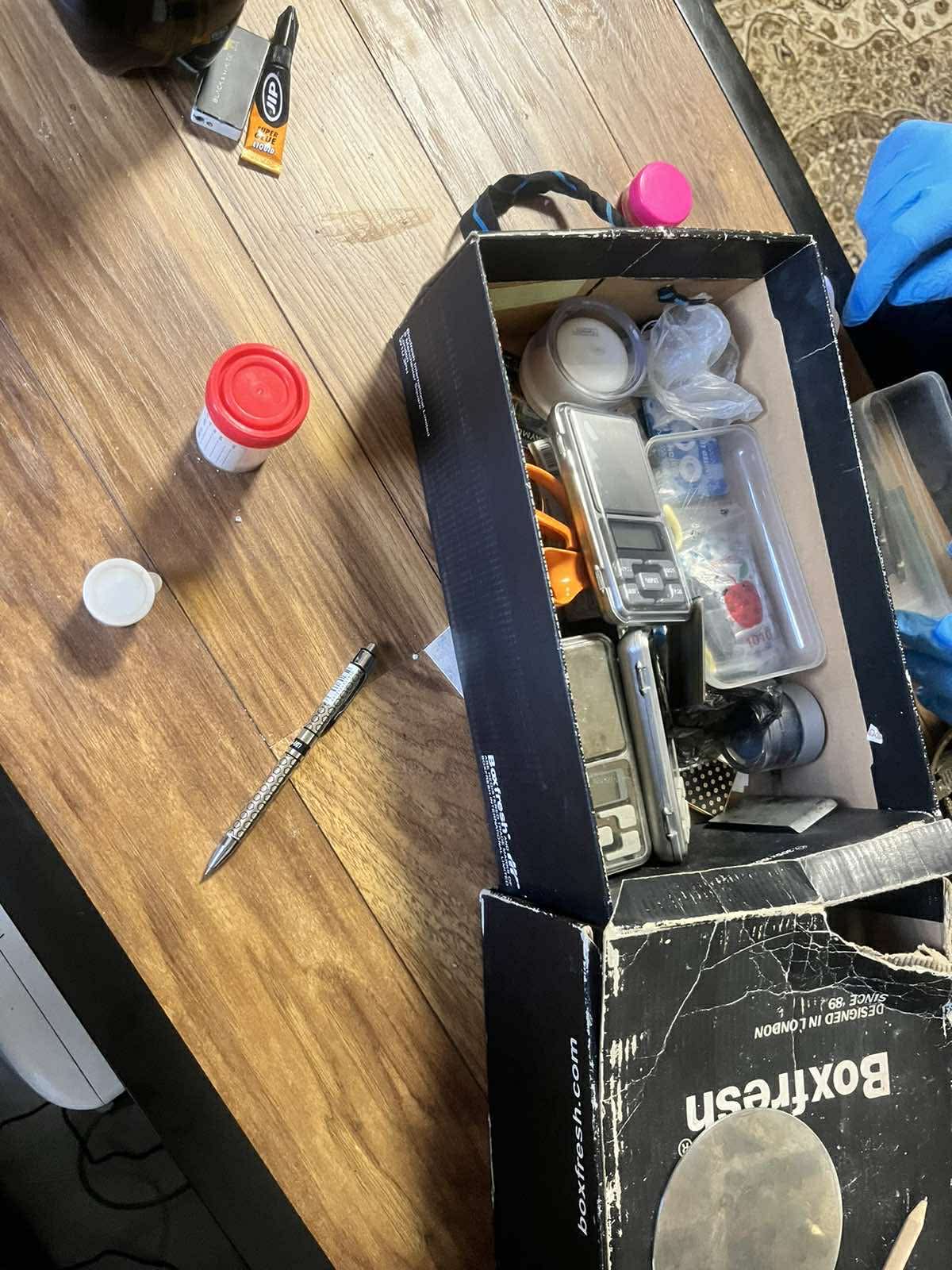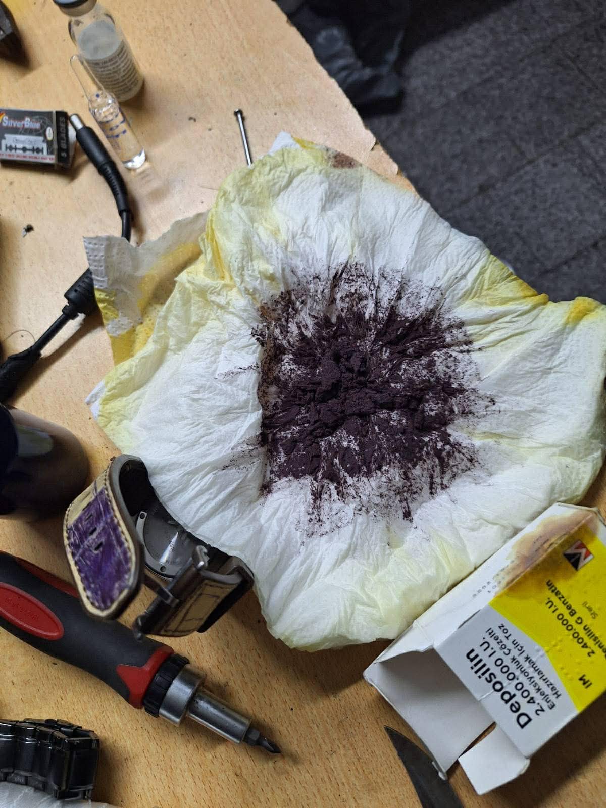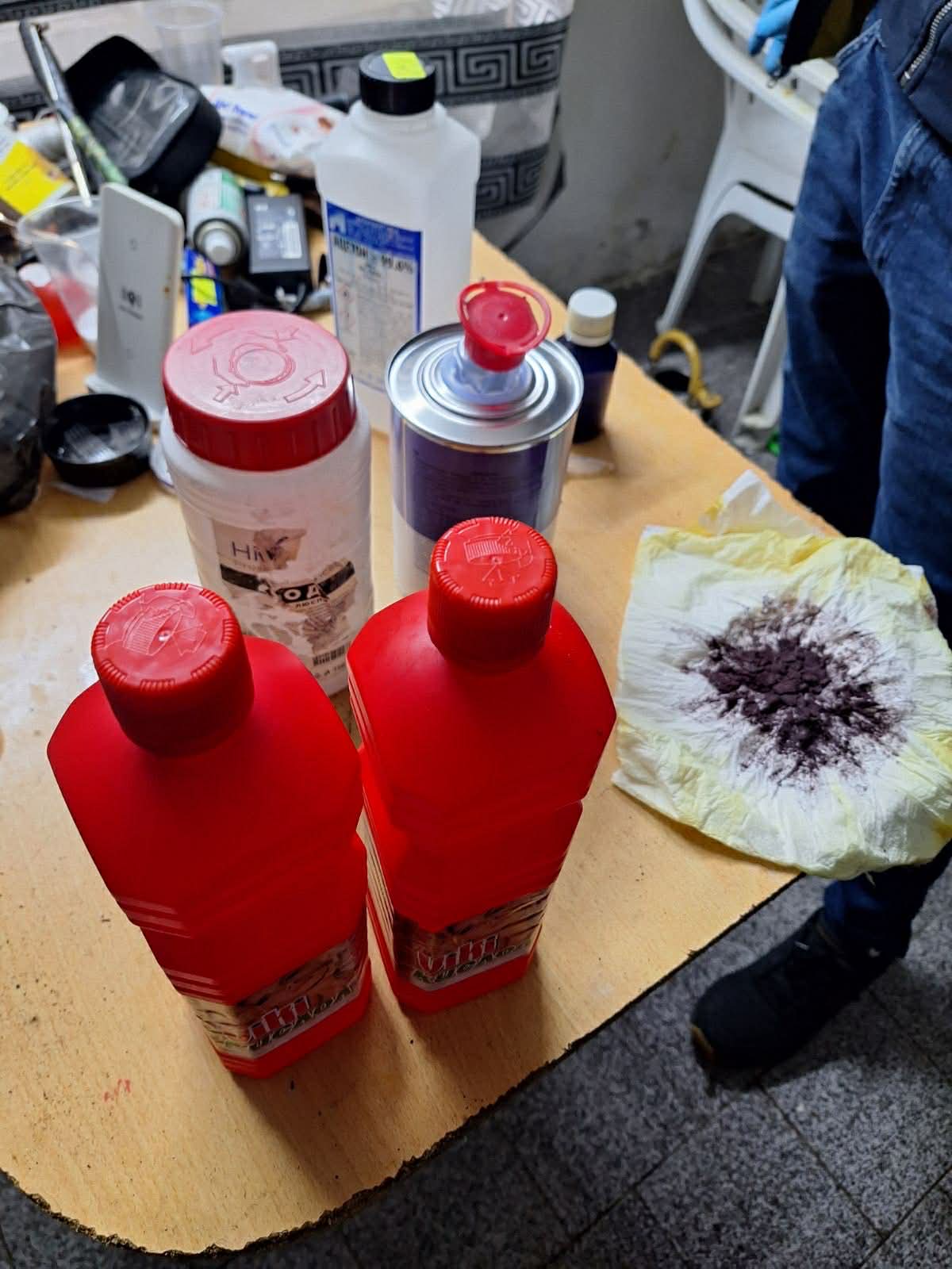 Криминално проявеният мъж разполагал с две бутилки с кислол, бутилка с люспи за почистване, бутилки с корселин, йод и ацетон, червено прахообразно вещество, което реагирало на фосфор, електронна везна, пакет с надпис "MCM" с тегло около 200 грама и др. Със сигурност става дума за нарколаборатория в домашни условия.