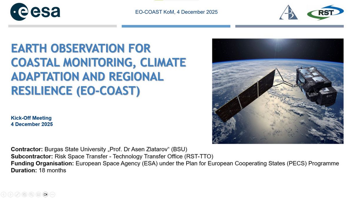 Бургаският държавен университет „Проф. д-р Асен Златаров“ стартира нов образователен проект Earth Observation for coastal monitoring, climate adaptation and regional resilience (EO-COAST) финансиран от Европейската космическа агенция (ESA), насочен към развитие на капацитет и модерни умения за използване на технологии за наблюдение на Земята (Earth Observation – EO) в анализа на морски и крайбрежни екосистеми, климатичната адаптация и регионалната устойчивост.