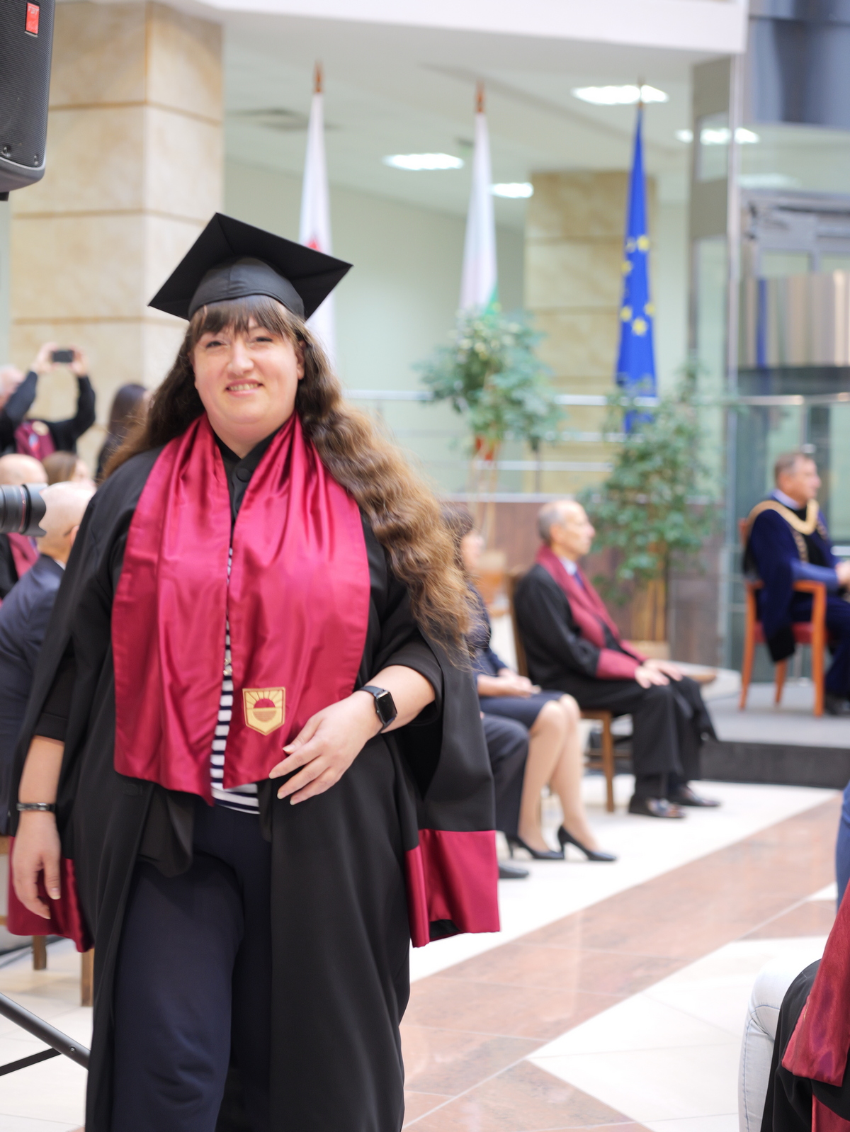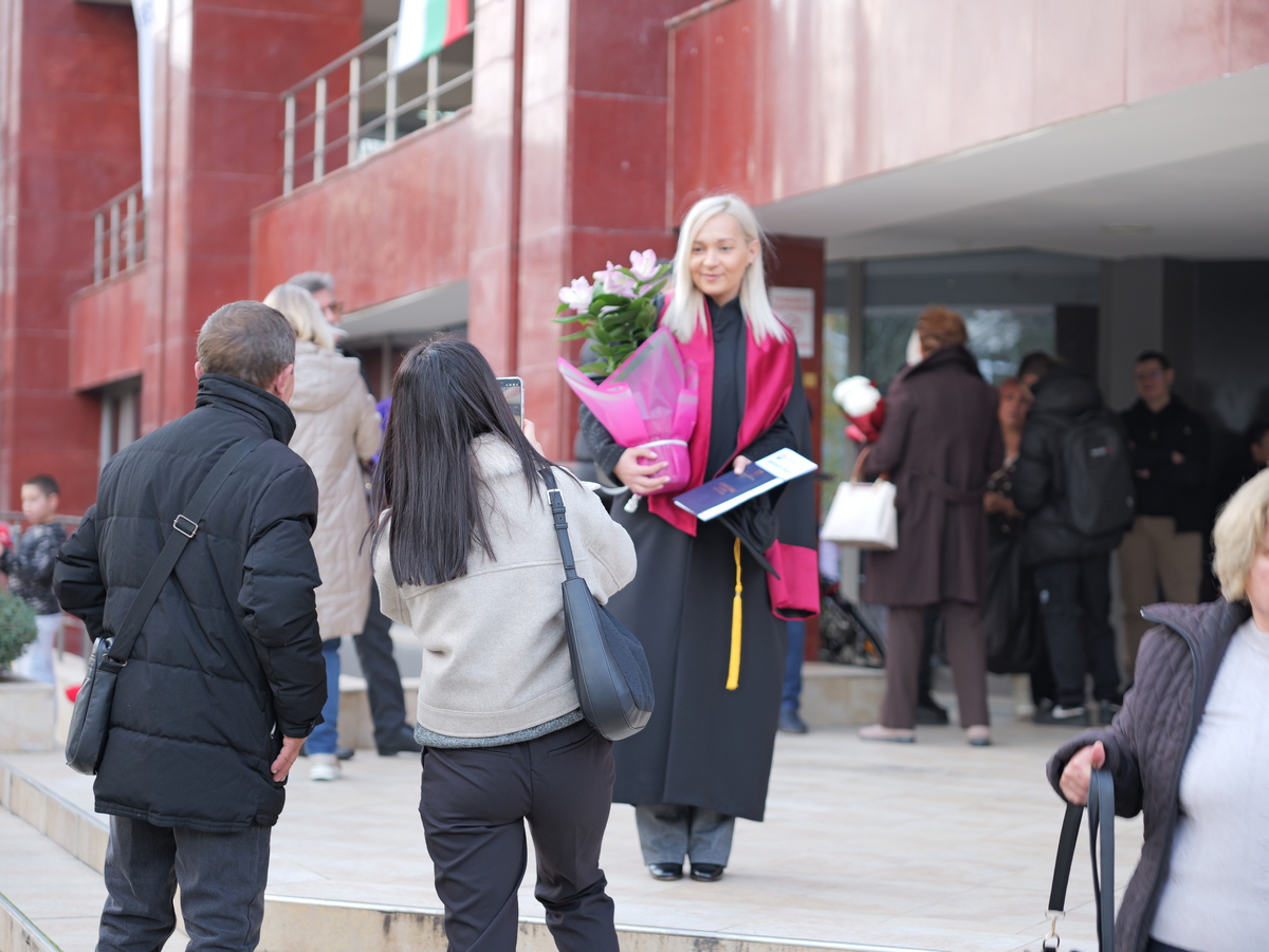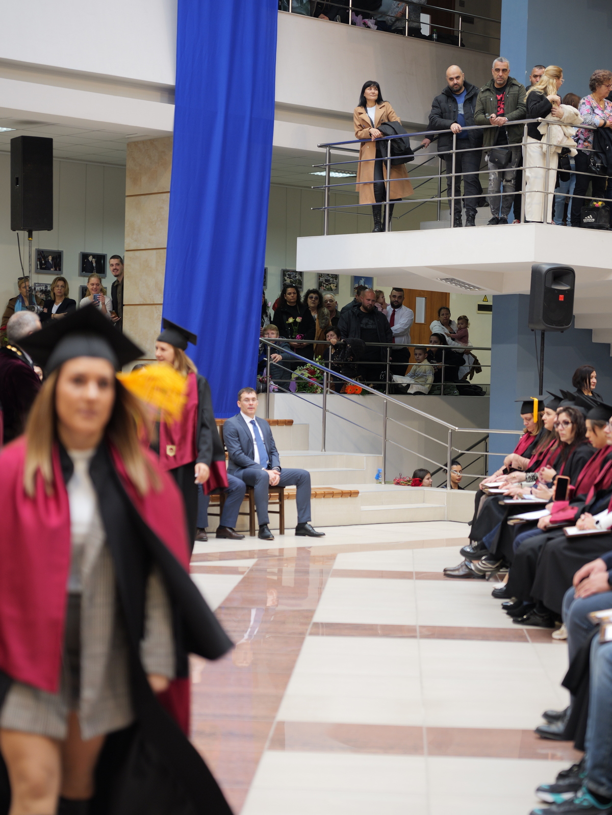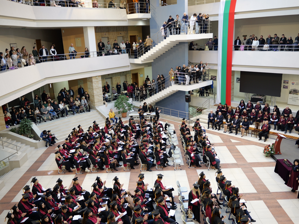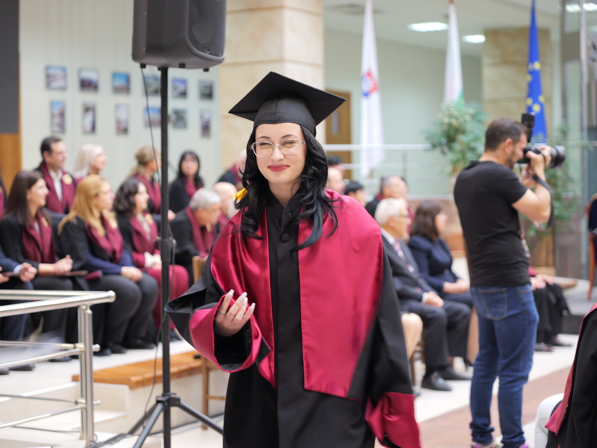 От името на абсолвентите приветствие поднесе Аля Казанджиева, магистър от специалност „Иновации и предприемачество в началното и предучилищното образование“ „Всеки от нас влиза в университета изпълнен с мечти и амбиции. Днес си тръгваме като личности, развили се чрез усилия, дисциплина, вдъхновение и непрекъснато учене. Пътят беше предизвикателен, но именно тези предизвикателства ни изградиха, както и подкрепата, насоките и отдадеността на нашите преподаватели, които стояха до нас през всяка стъпка от този път“ – каза в приветствието си Аля Казанджиева.