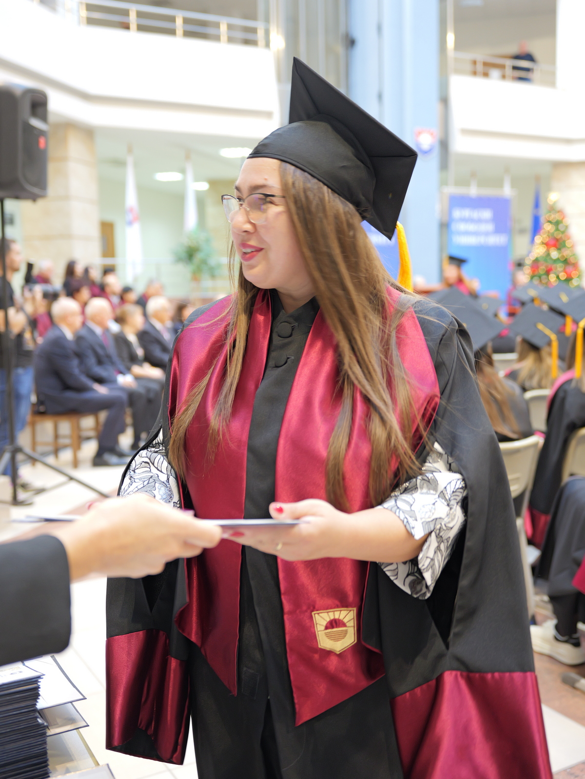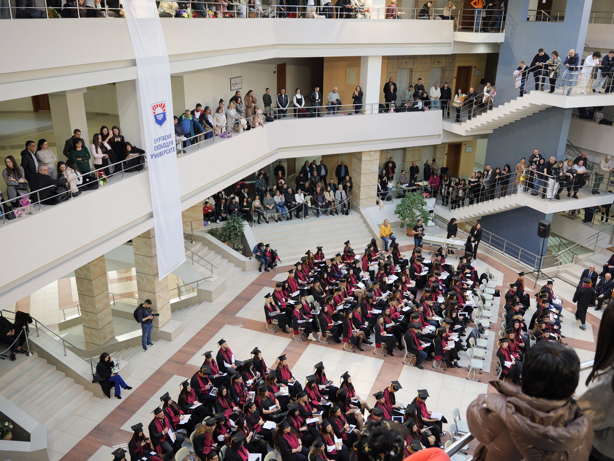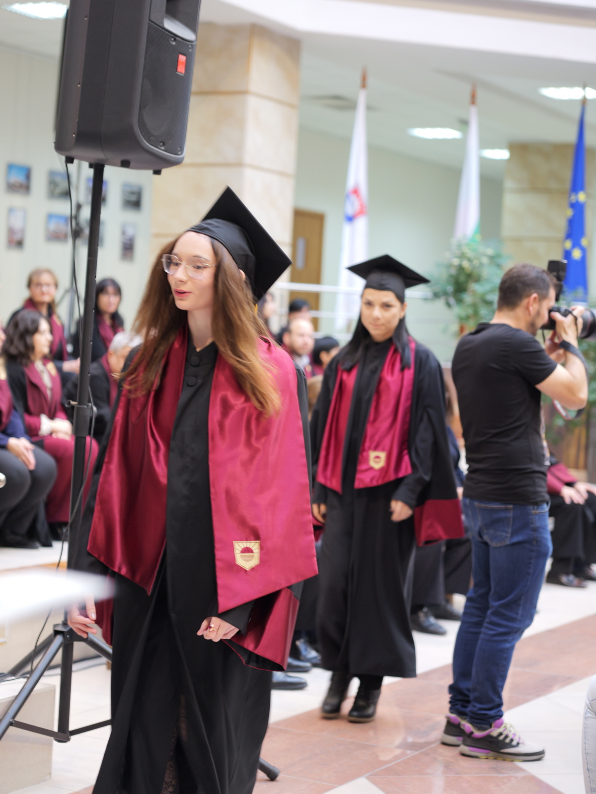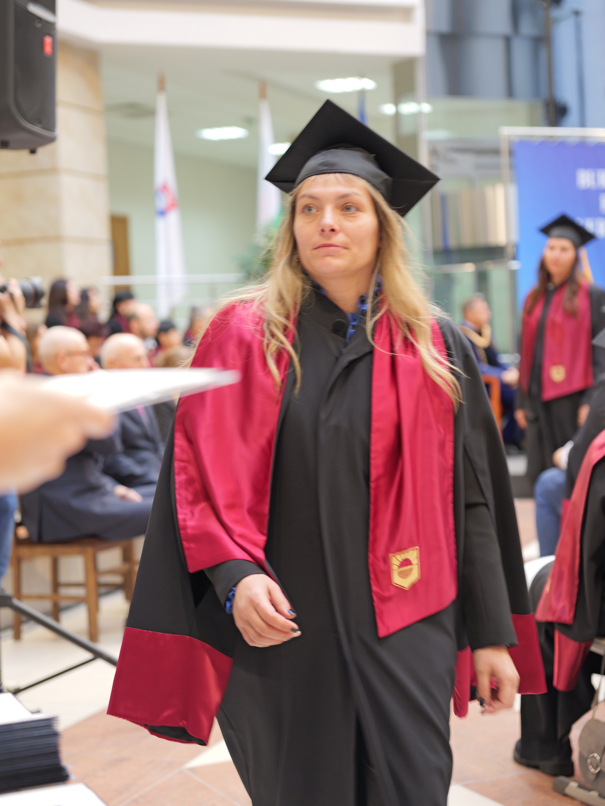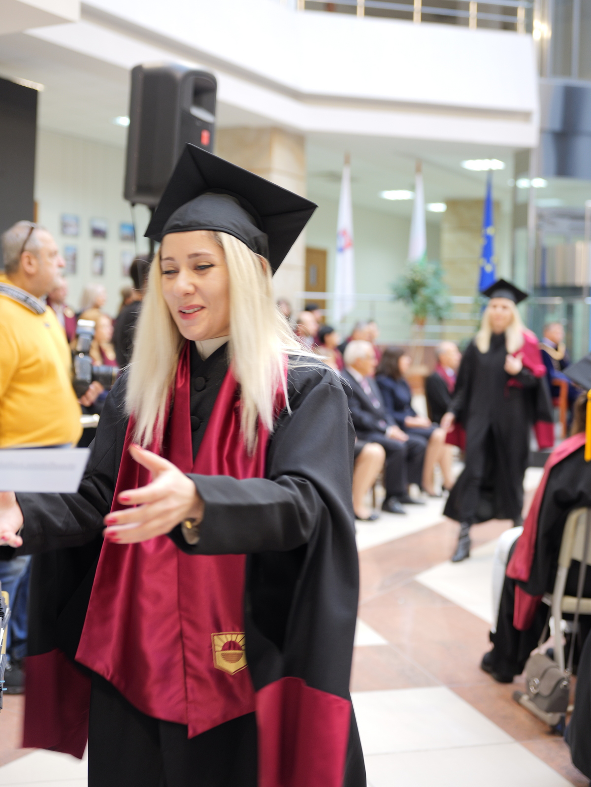 От името на абсолвентите приветствие поднесе Аля Казанджиева, магистър от специалност „Иновации и предприемачество в началното и предучилищното образование“ „Всеки от нас влиза в университета изпълнен с мечти и амбиции. Днес си тръгваме като личности, развили се чрез усилия, дисциплина, вдъхновение и непрекъснато учене. Пътят беше предизвикателен, но именно тези предизвикателства ни изградиха, както и подкрепата, насоките и отдадеността на нашите преподаватели, които стояха до нас през всяка стъпка от този път“ – каза в приветствието си Аля Казанджиева.